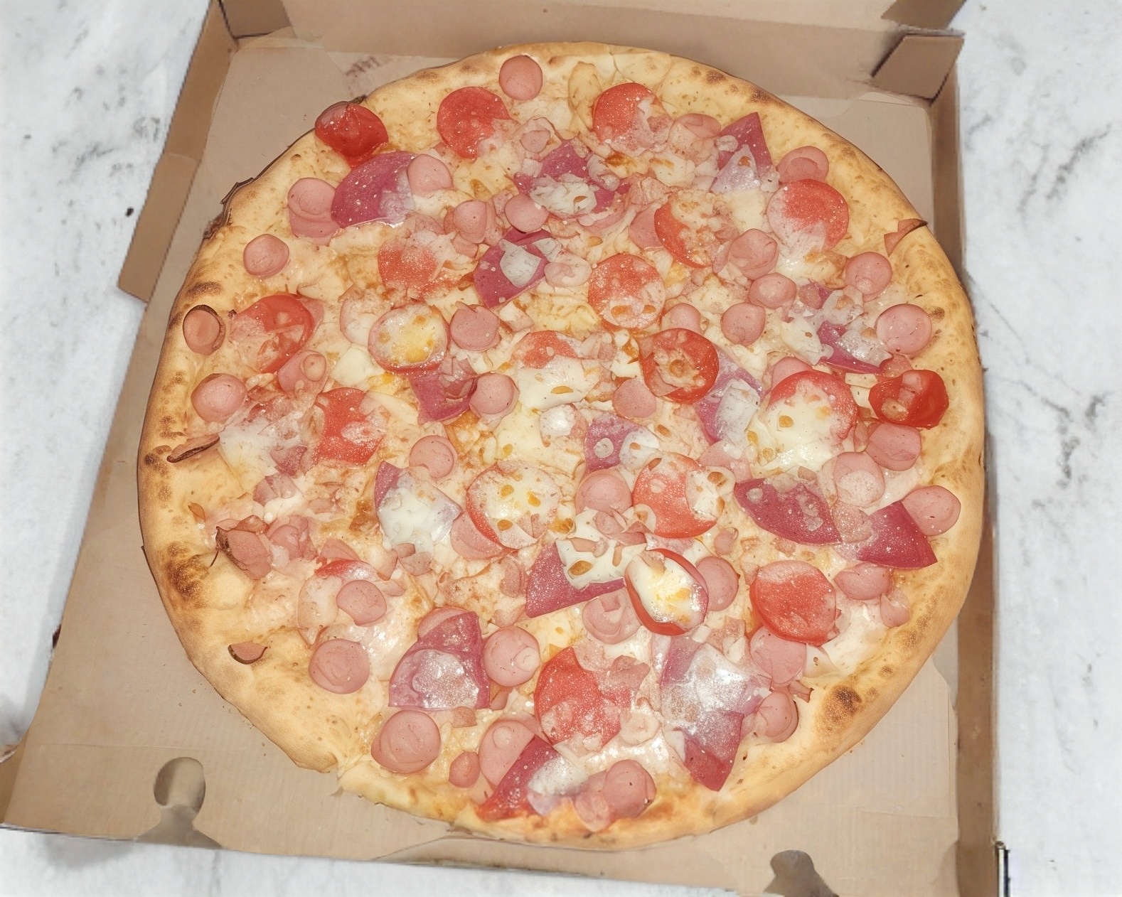 salsa de tomate, jamón, salchicha, tocino, peperoni y queso
