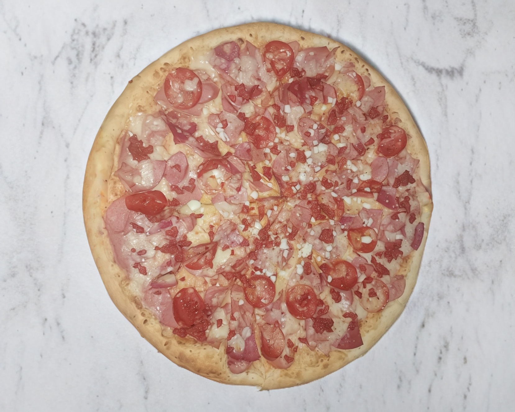 Jamón, salchicha, salami, pepperoni, chorizo, tocino y cebolla.