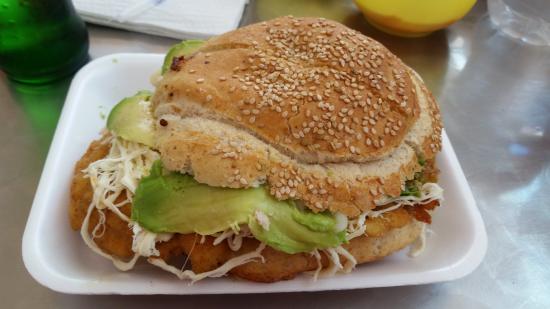 Milanesa de puerco, quesillo, aguacate, cebolla y pápalo.