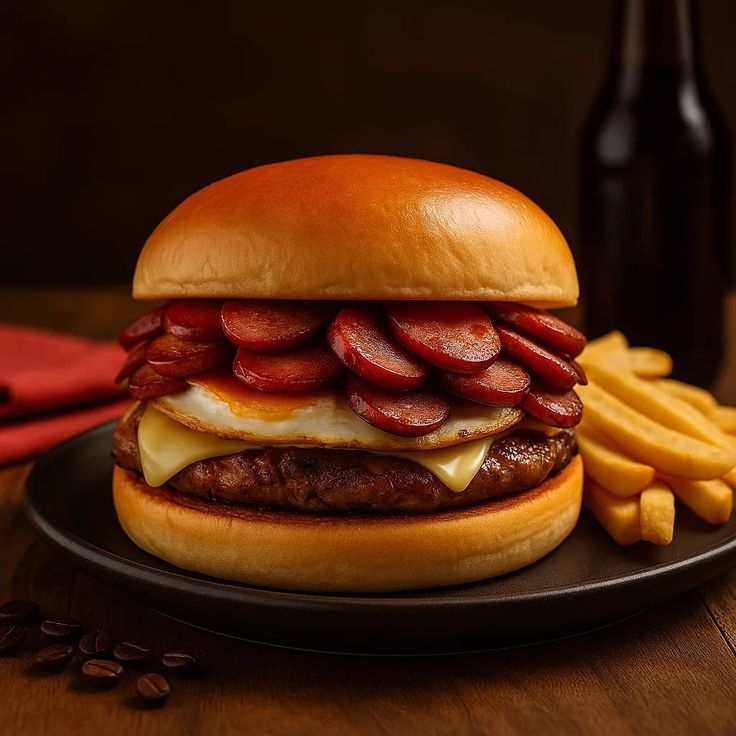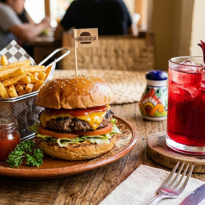 Deliciosa hamburguesa clásica carne fresca echa en casa , acompañada de 200gr de papas fritas naturales y agua de Jamaica