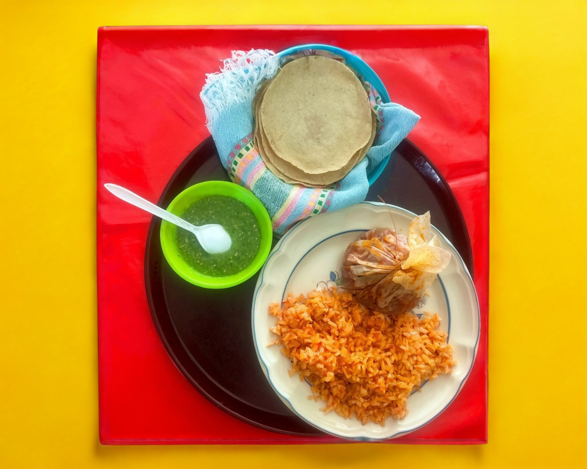 Mixiote tradicional acompañado de arroz, salsa y tortillas.