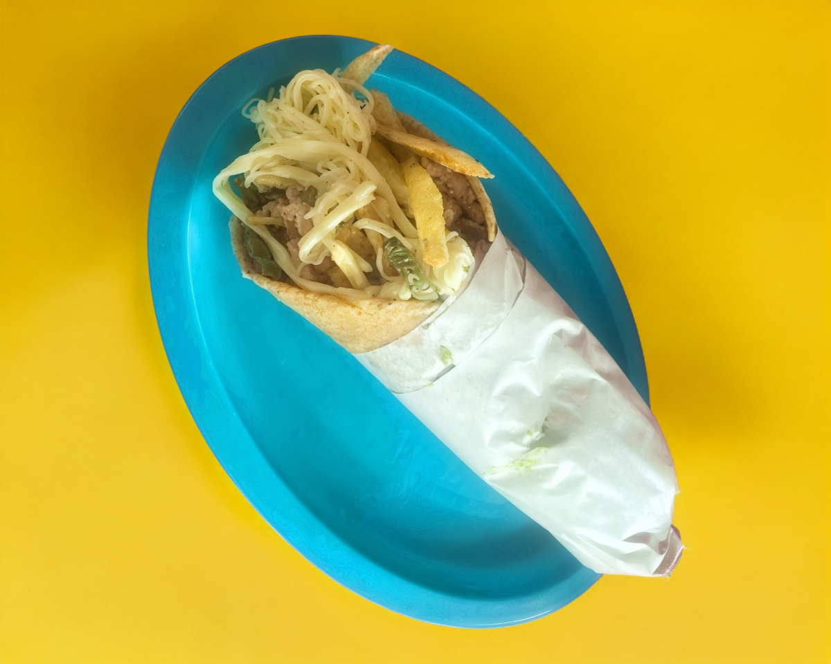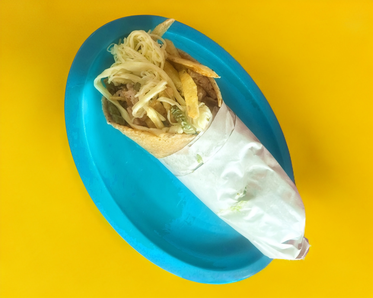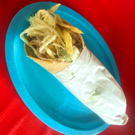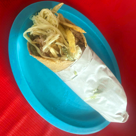 Taco mixto de bistec y quesillo con aguacate, papas, nopales, cebolla y rajas.
