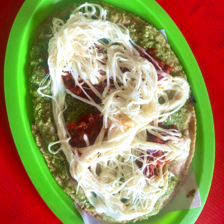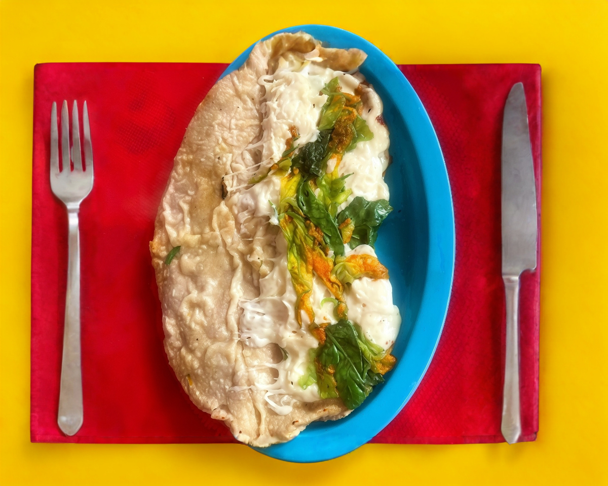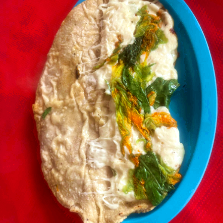 “Quesadilla de quesillo con chicharrón; opción de flor de calabaza.