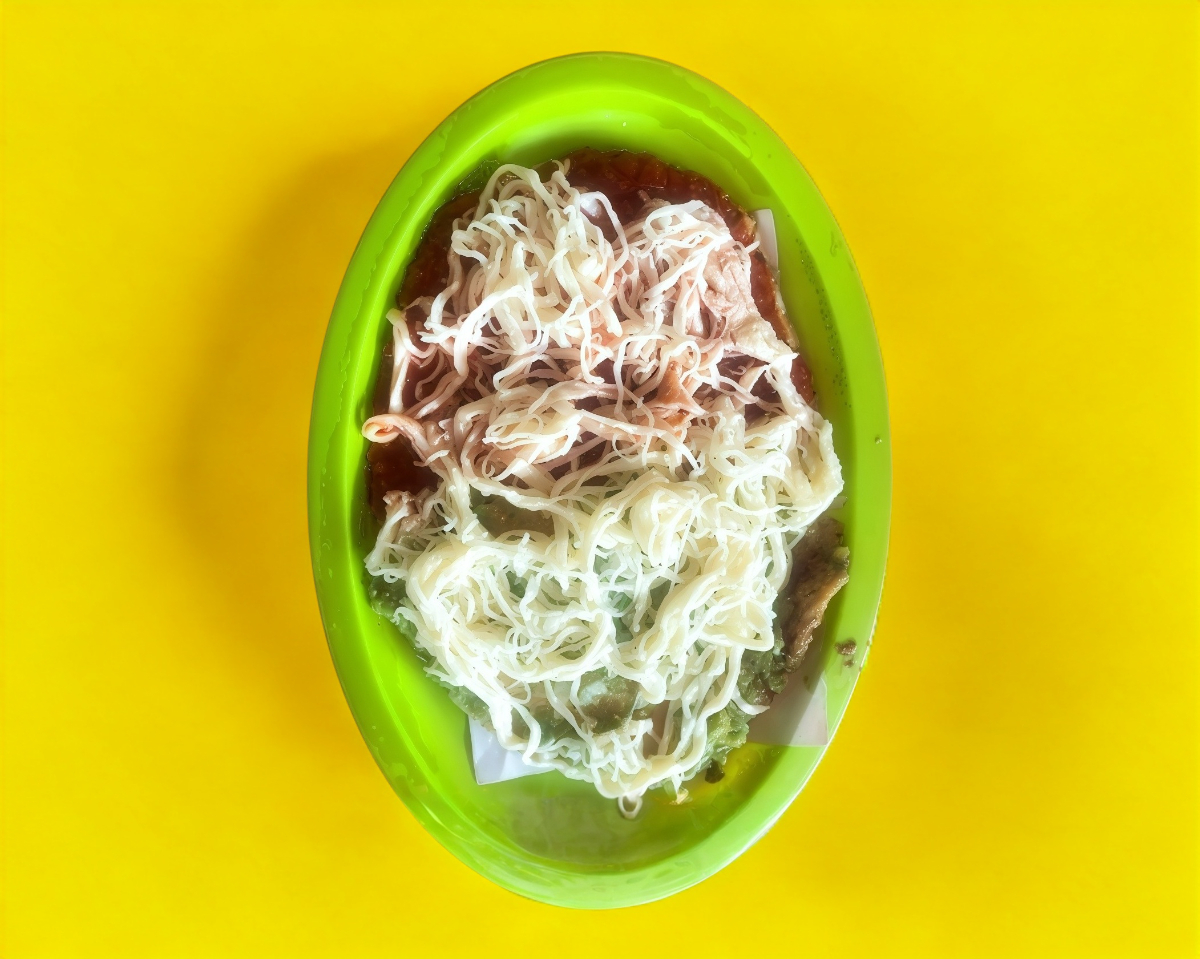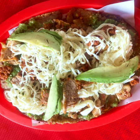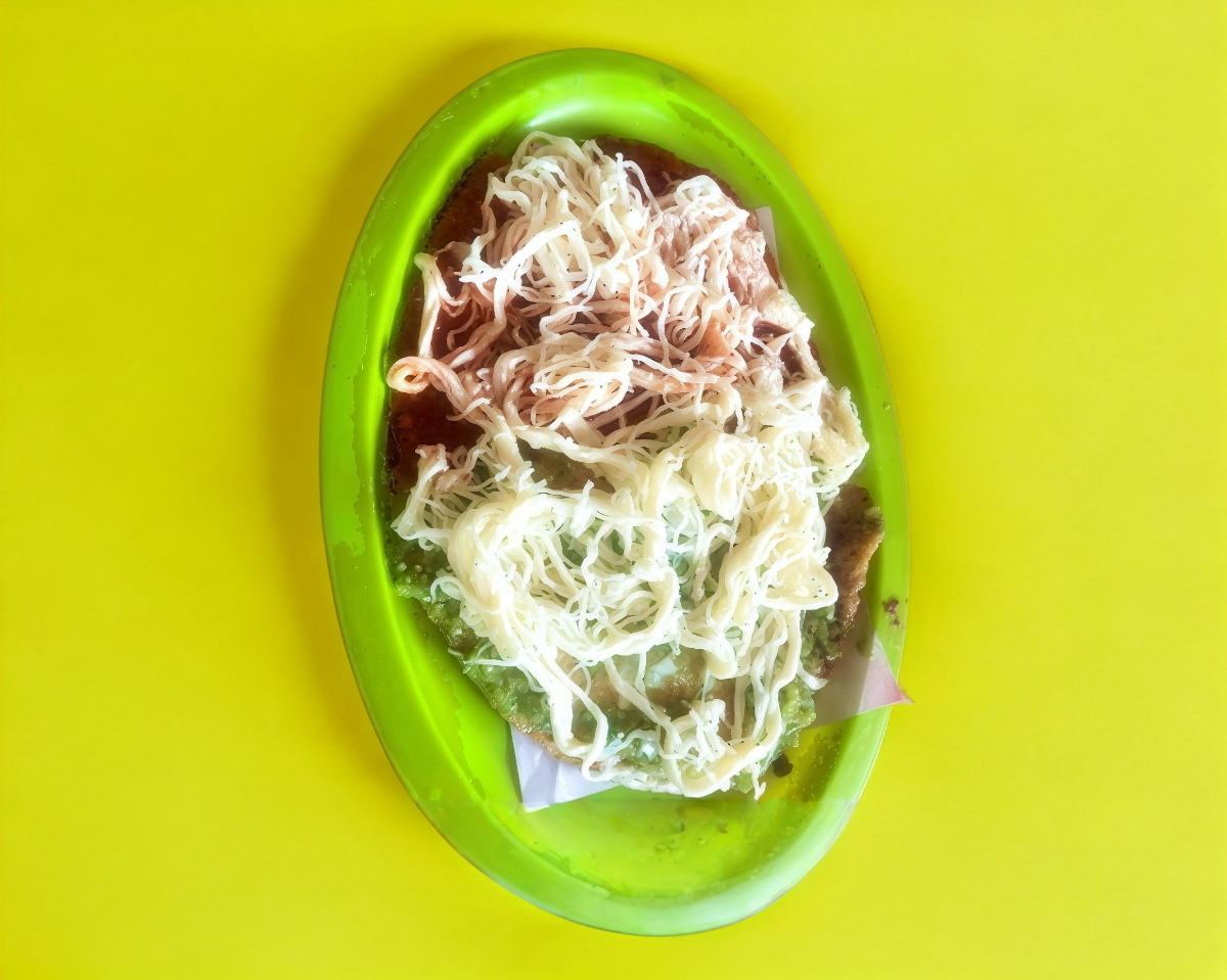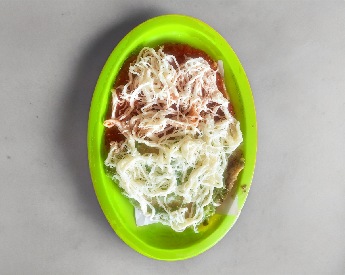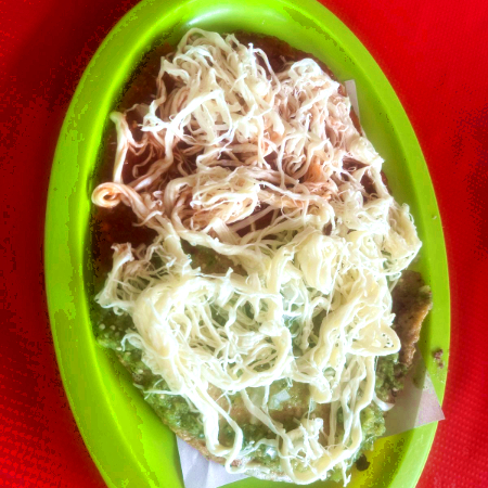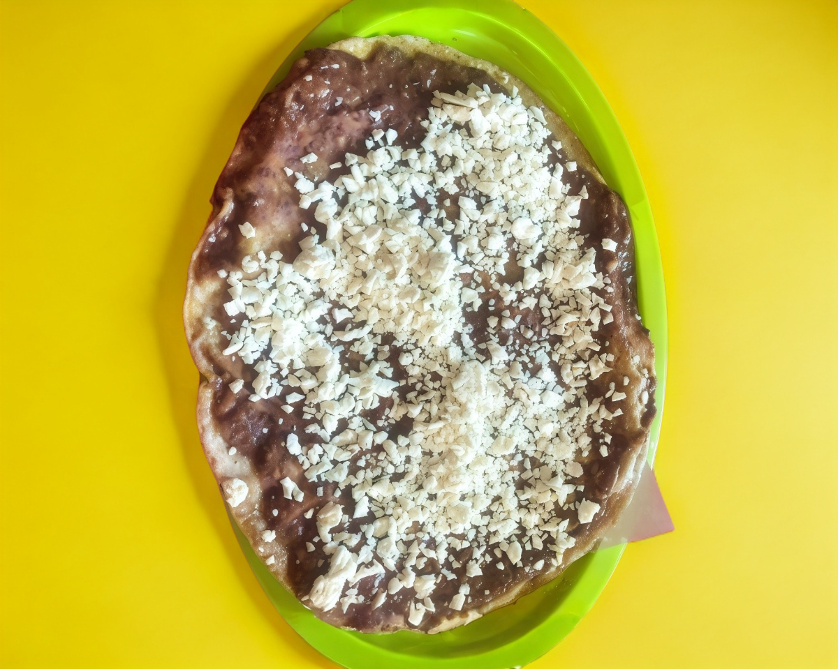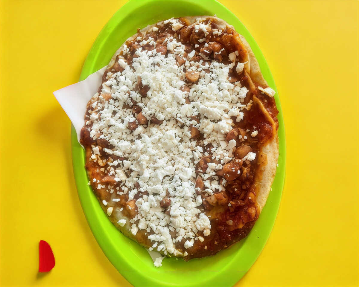 Gordita de maíz rellena con salsa, queso fundido y cebolla.