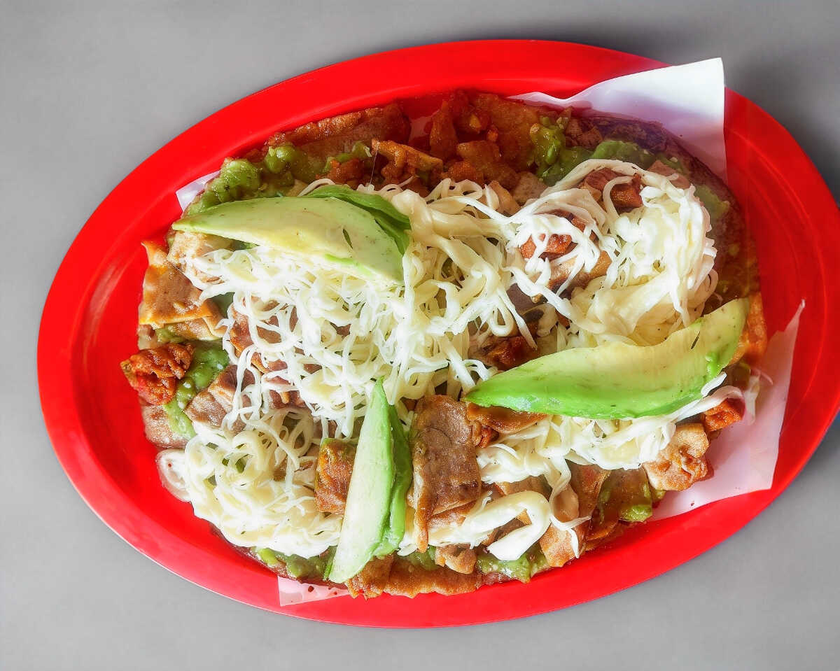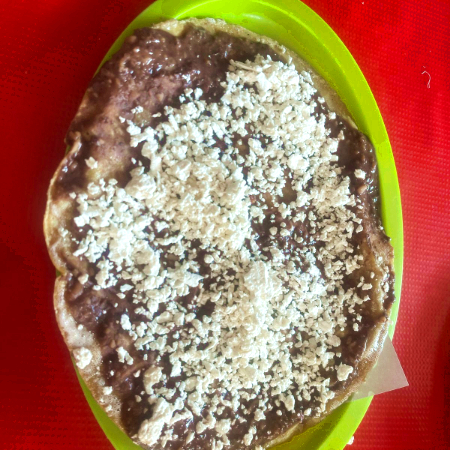 Gordita de maíz rellena con salsa, quesillo y crema.