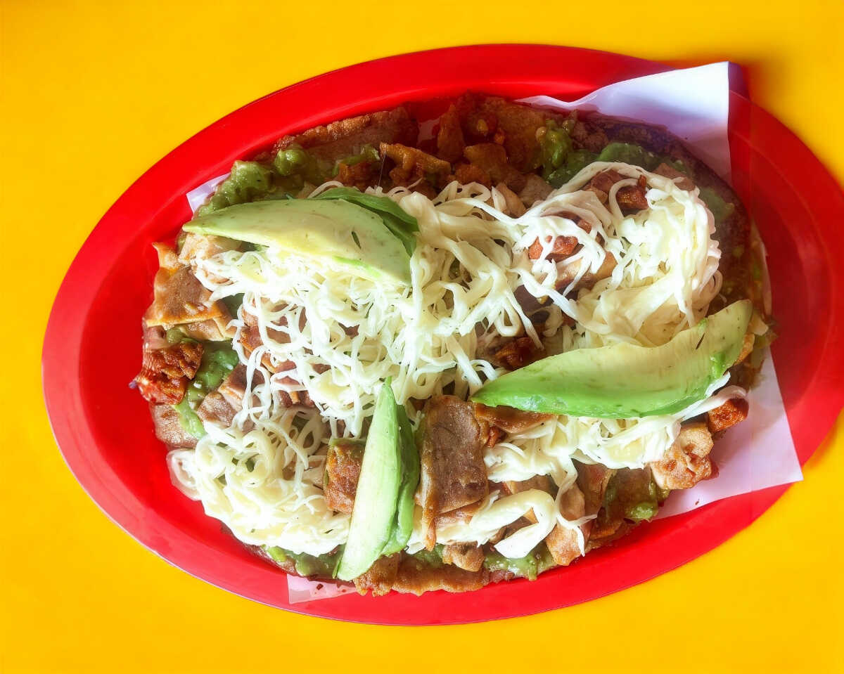 Gordita de maíz rellena de bistec a la plancha, aguacate, quesillo y salsa.