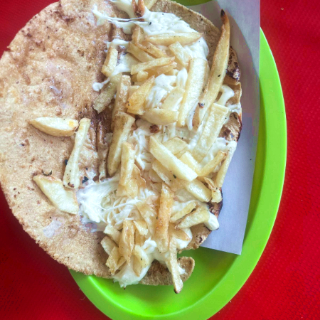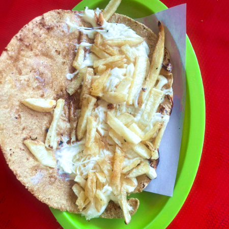 Gordita de maíz rellena con salsa, quesillo y papas.