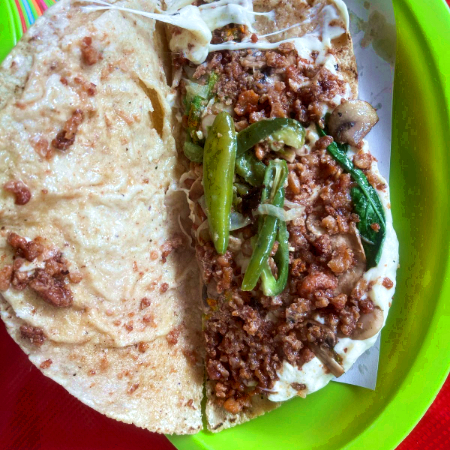 Quesadilla surtida con quesillo, champiñón, chicharrón, flor, bistec, longaniza y rajas.