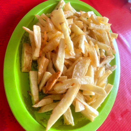 Gordita de maíz con bistec, papas, quesillo y salsa.