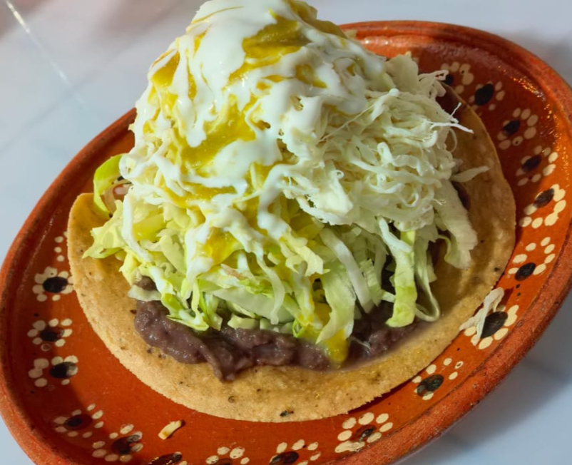 Tortilla de maíz crujiente con base de frijoles, lechuga, crema y salsa. Elige entre pollo o res.