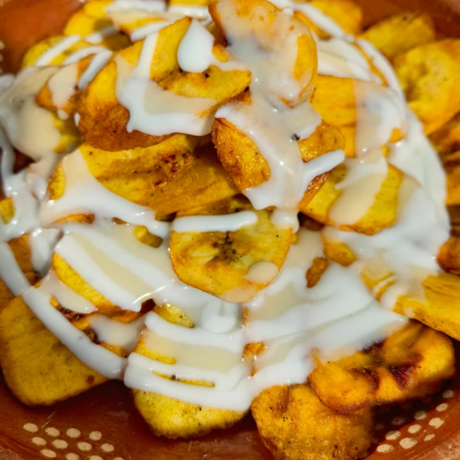 Rebanadas de plátano macho fritas al punto exacto, acompañadas de crema y leche condensada.