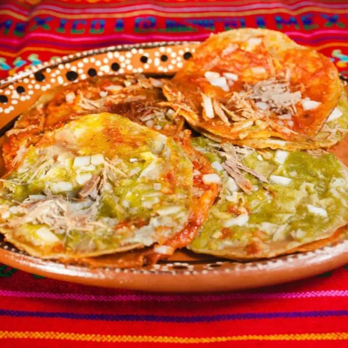 Seis piezas de nuestras icónicas tortillas pequeñas bañadas en salsa verde o roja, con cebolla y carne deshebrada.