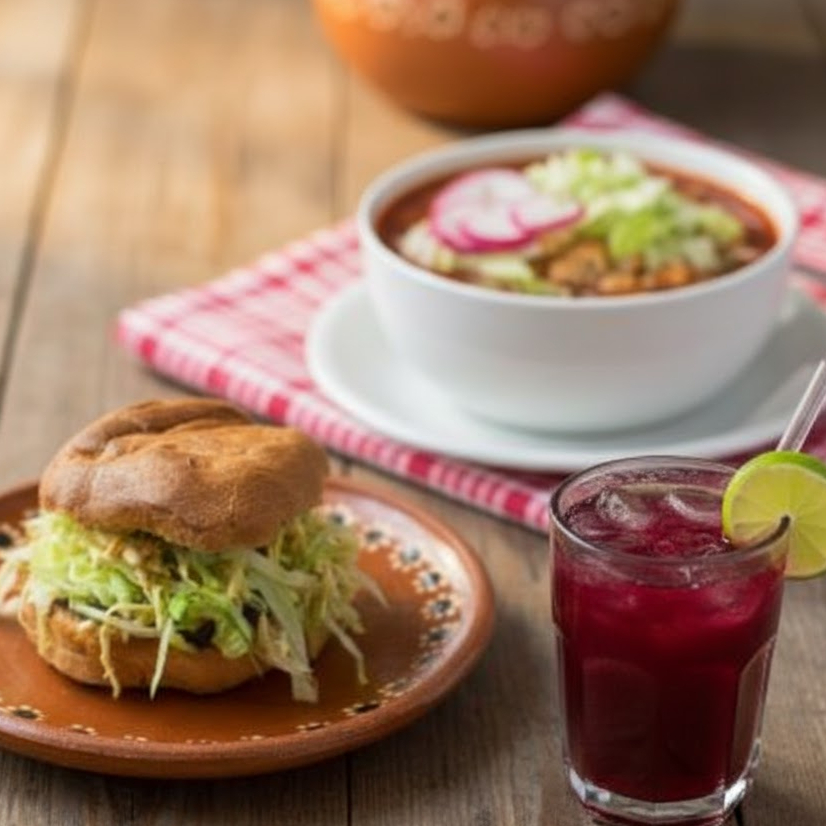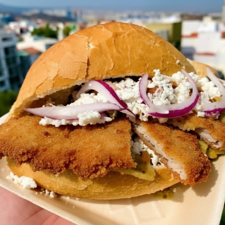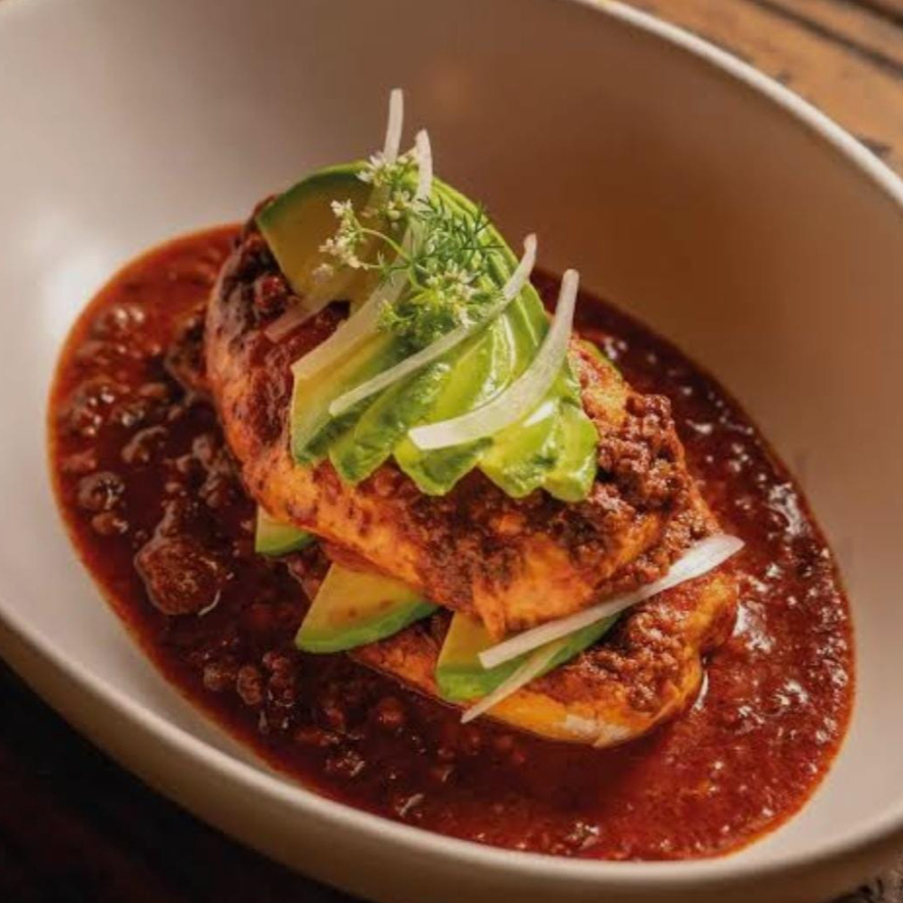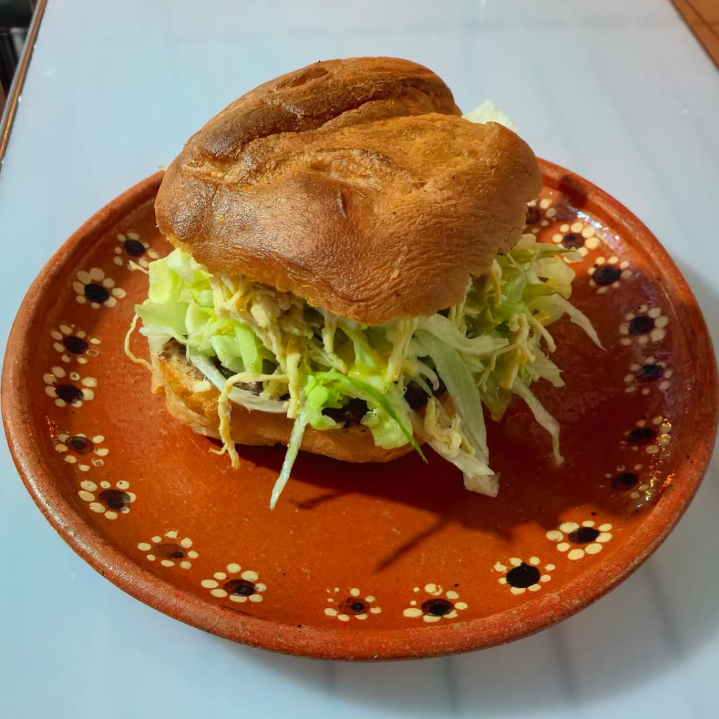 El clásico pan "chancla" bañado en una irresistible salsa roja de chiles secos, relleno de aguacate, cebolla y tu elección de pollo o carne.