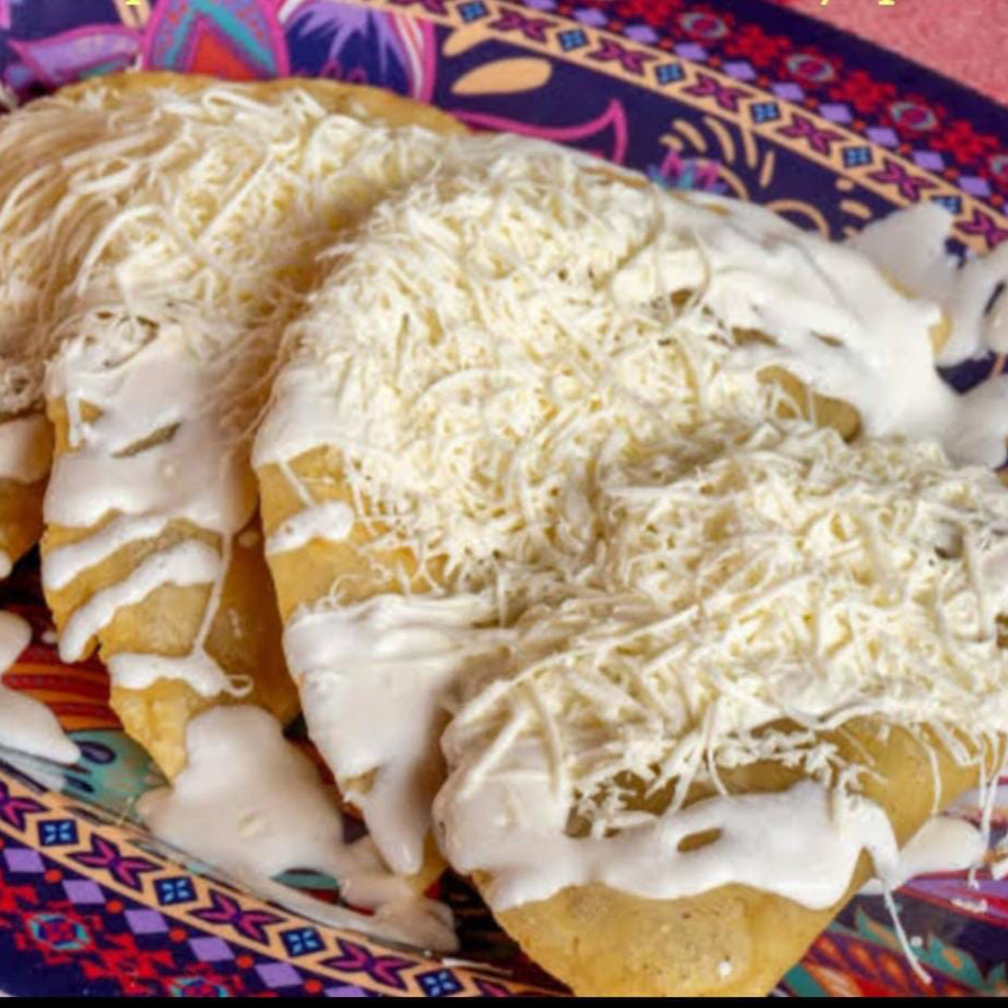 orden de 3 empanadas rellenas de carne (molida) cubiertas con queso crema (salsa aparte)