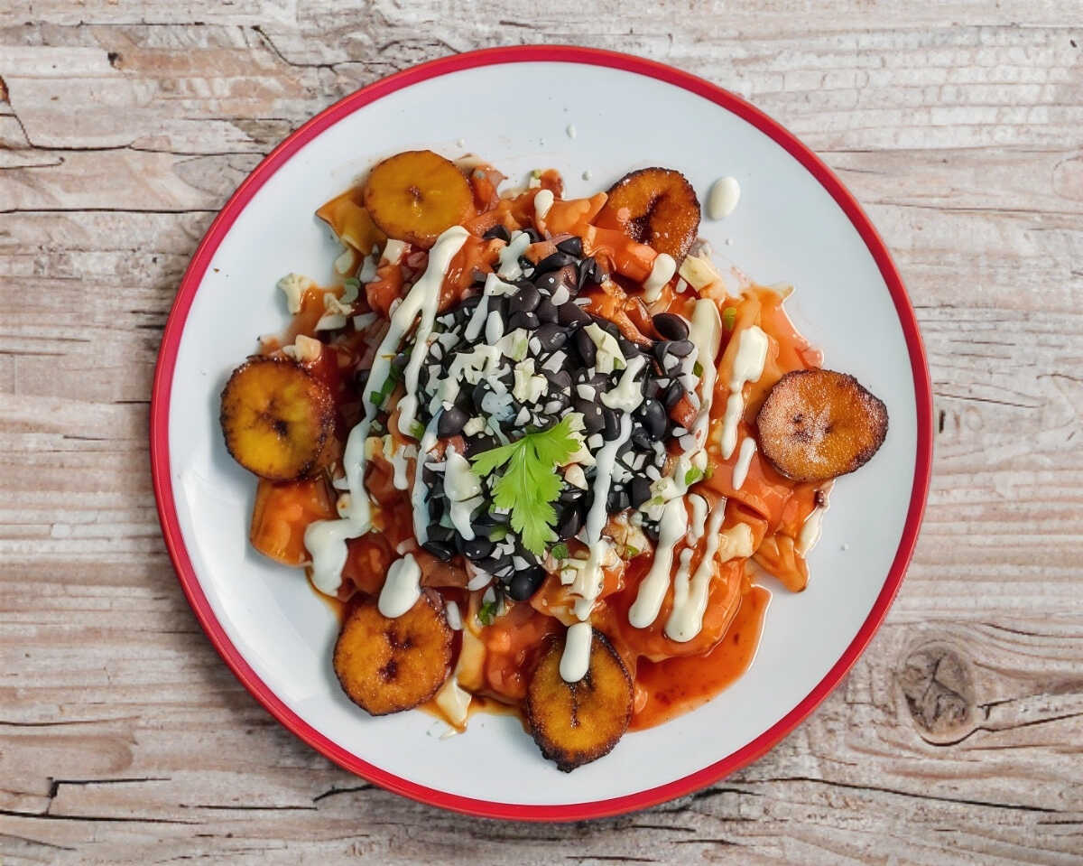CHILAQUILES ROJOS TRADICIONALES CON PLÁTANO MACHO