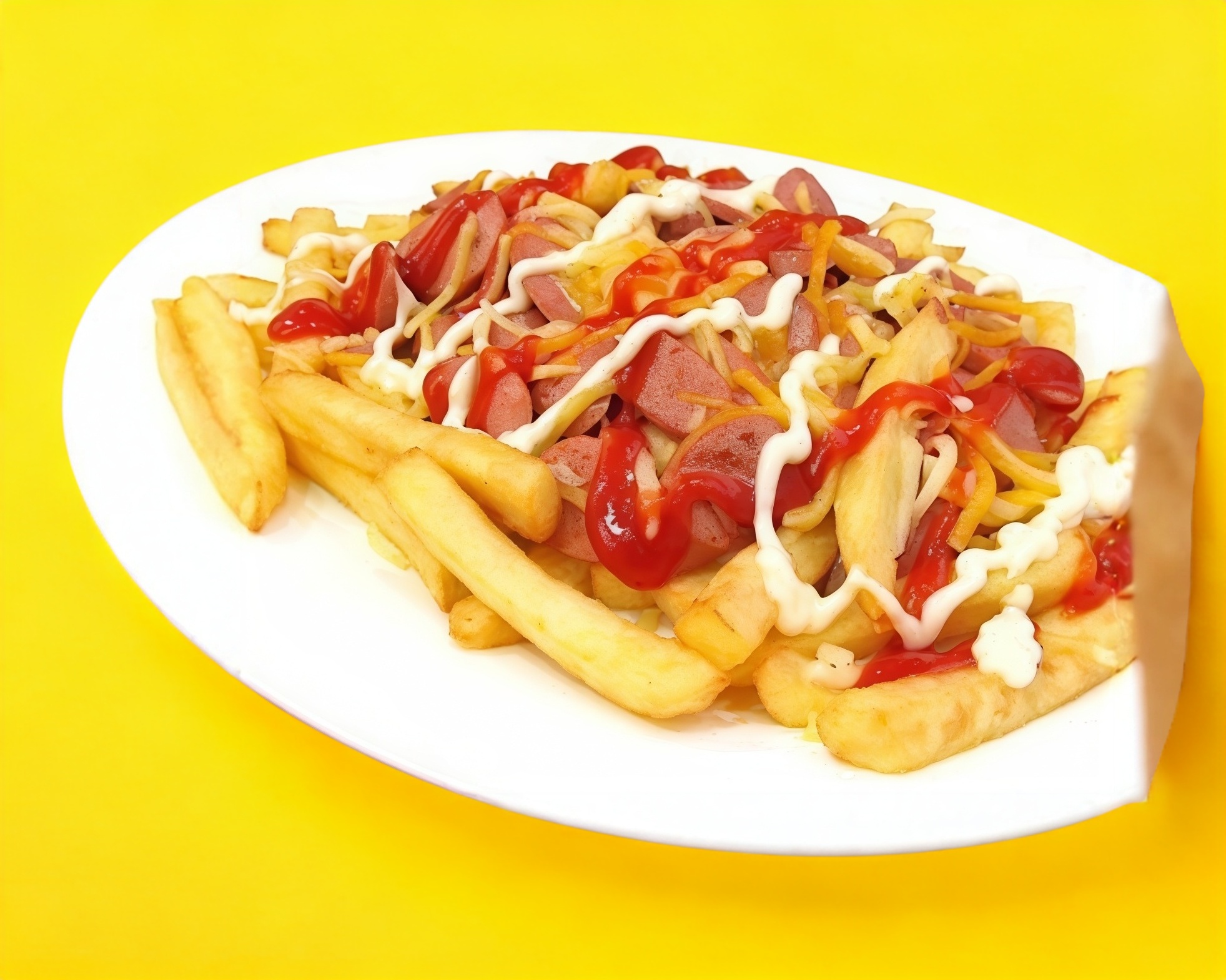 Orden papas con salchichas en rodajas.