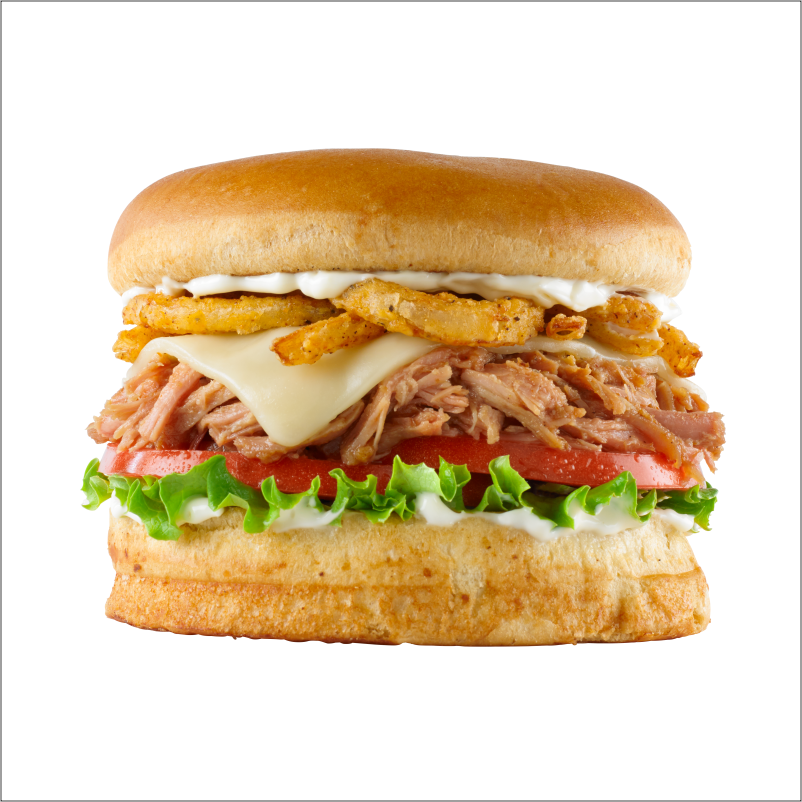 Pan brioche tostado, pierna de cerdo deshebrada 85 g con salsa BBQ, queso manchego, tiras de cebolla crujientes, jitomate, lechuga y mayonesa.