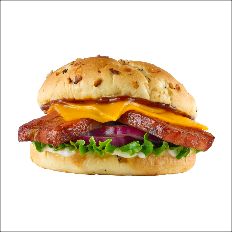 Pan de cebolla, 2 rebanadas de pork belly crujiente con queso cheddar BBQ, cebolla morada, jitomate, lechuga y mayonesa.