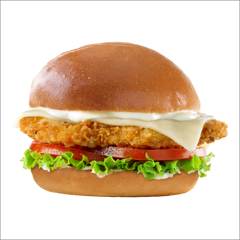 Pan brioche, filete de pechuga de pollo crujiente acompañado con queso manchego, lechuga, jitomate y mayonesa.
