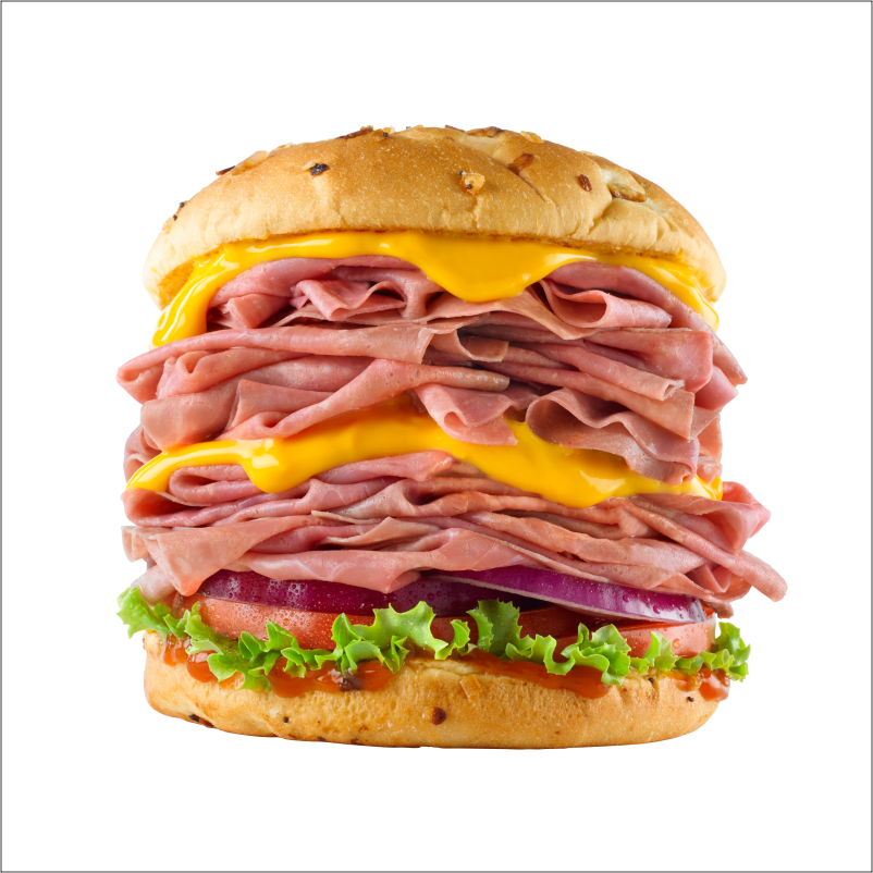 Pan de cebolla, roast beef 170 g calientita y rebanado finamente con salsa de queso cheddar, aderezo red ranch, cebolla morada, jitomate y lechuga.