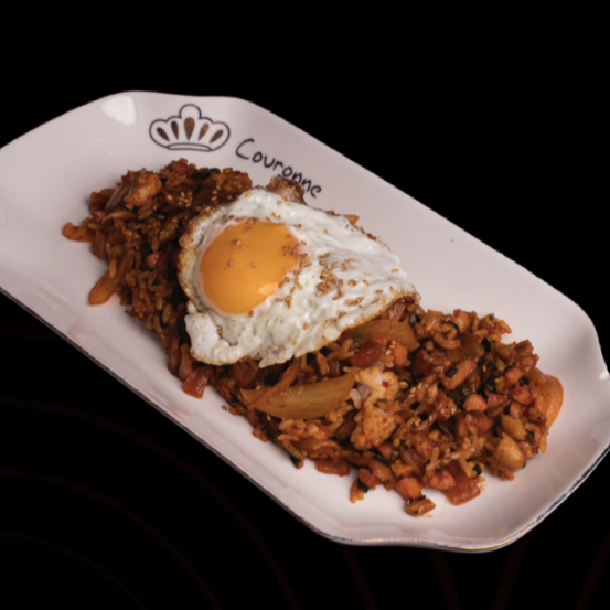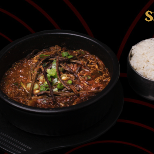 Nuestro Dolsot es un tazón de arroz frito en una olla de piedra caliente, creando una capa crujiente en el fondo. Se sirve con una porción de carne de res (diezmillo), verduras salteadas, un huevo estrellado y nuestra salsa picante (gochujang), qur puedes mezclar a tu gusto.