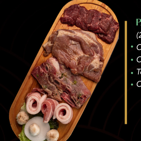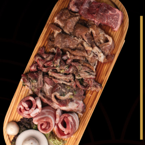 (2 - 3) perosnas, costilla de res marinada, costilla de cerdo marinada, tocino natural y costilla de res deshuesada.