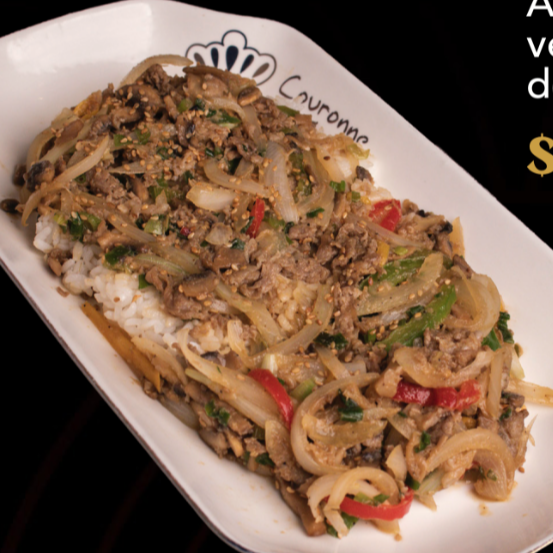 Tazón de arroz al vapor que va acompañada de una mezcla de vegetables frescos y tiras de carne de res marinada en nuestra deliciosa salsa dulce y salada, inspirada en las recetas de tradición en Corea.