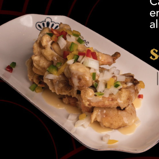 Calamares salteados con verduras frescas, bañados en una salsa picante que realza los sabores del mar. Este plato se sirve sobre una cama de arroz blanco al vapor para complementar cada bocado.
