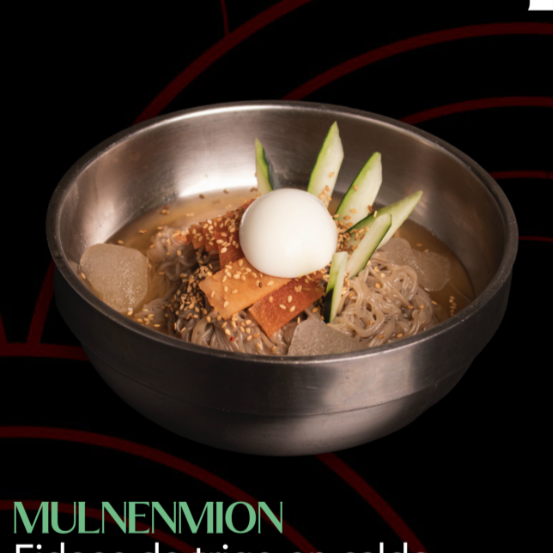 Fideos de trigo en un caldo frío y refrescante, con finas rodajas de pepino, nabo y medio huevo duro, todo cubierto con nuestra salsa picante.