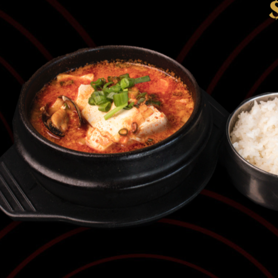 Carne de cerdo con tofu, verduraas y una exquisita selección de mariscos en una sopa picante, todo hehco en una olla de piedra.