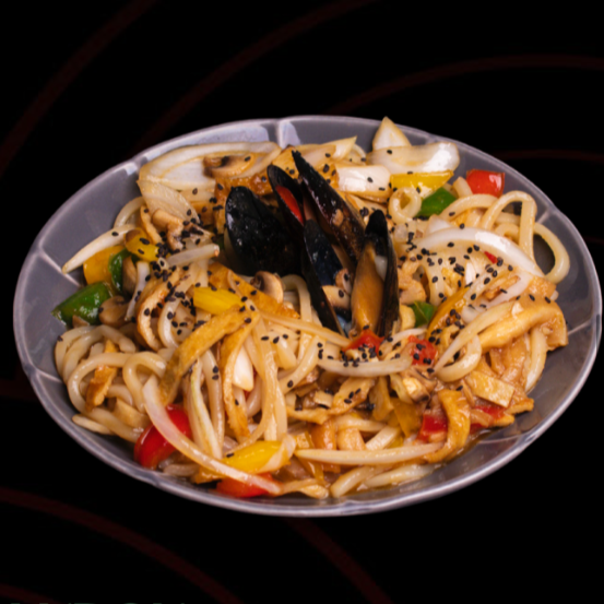 Fideos gruesos de udón y masticables, salteados con una mezcla de vegetales frescos y mariscos.