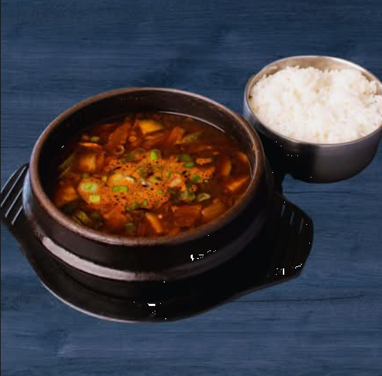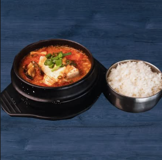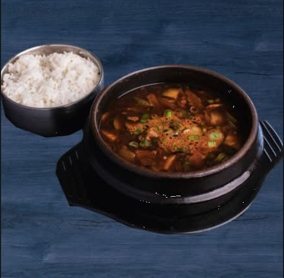 Carne de cerdo con tofu, verduras y una exquisita selección de mariscos en una sopa picante, todo servido en una olla de piedra que mantiene el calor. Un platillo reconfortante, lleno de sabor y un toque picante.