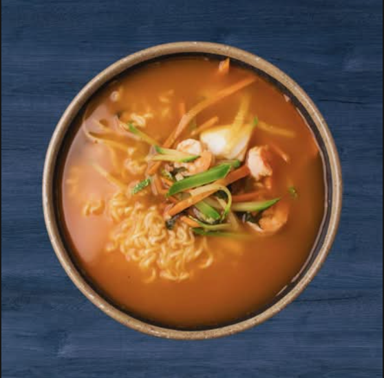 Fideos ramen con una mezcla de verduras frescas y mariscos, servidos en un caldo picante y sustancioso, con un sabor que te hará sentirte en Corea del Sur.