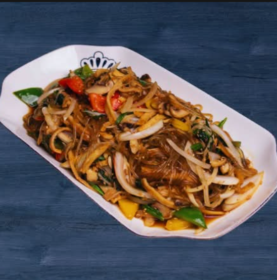 Un platillo tradicional coreano con fideos de camote, verduras y tortilla de pescado, salteados en una salsa de soya que le da un sabor dulce y salado. Un platillo lleno de sabor y con diferentes texturas que te encantará.
