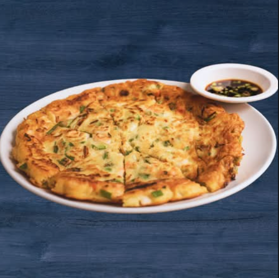 Una pizza estilo coreana, crujiente por fuera y suave por dentro, con una deliciosa combinación de mariscos y vegetales. Viene con una guarnición de salsa de soya para realzar los sabores.