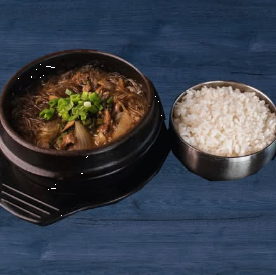 Una deliciosa mezcla de fideos de camote y vegetales frescos, salteados con tiras de carne de res marinada en nuestra salsa bulgogi y servidos en una olla de piedra caliente.