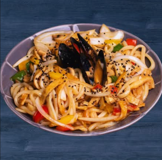 Fideos udon gruesos y masticables, salteados con una mezcla de vegetales frescos y mariscos, con un sabor que te hará sentirte en Corea del Sur.