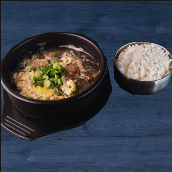 Un caldo caliente y reconfortante con rebanadas de pastel de arroz tteok, tiernos trozos de carne de res y huevo.