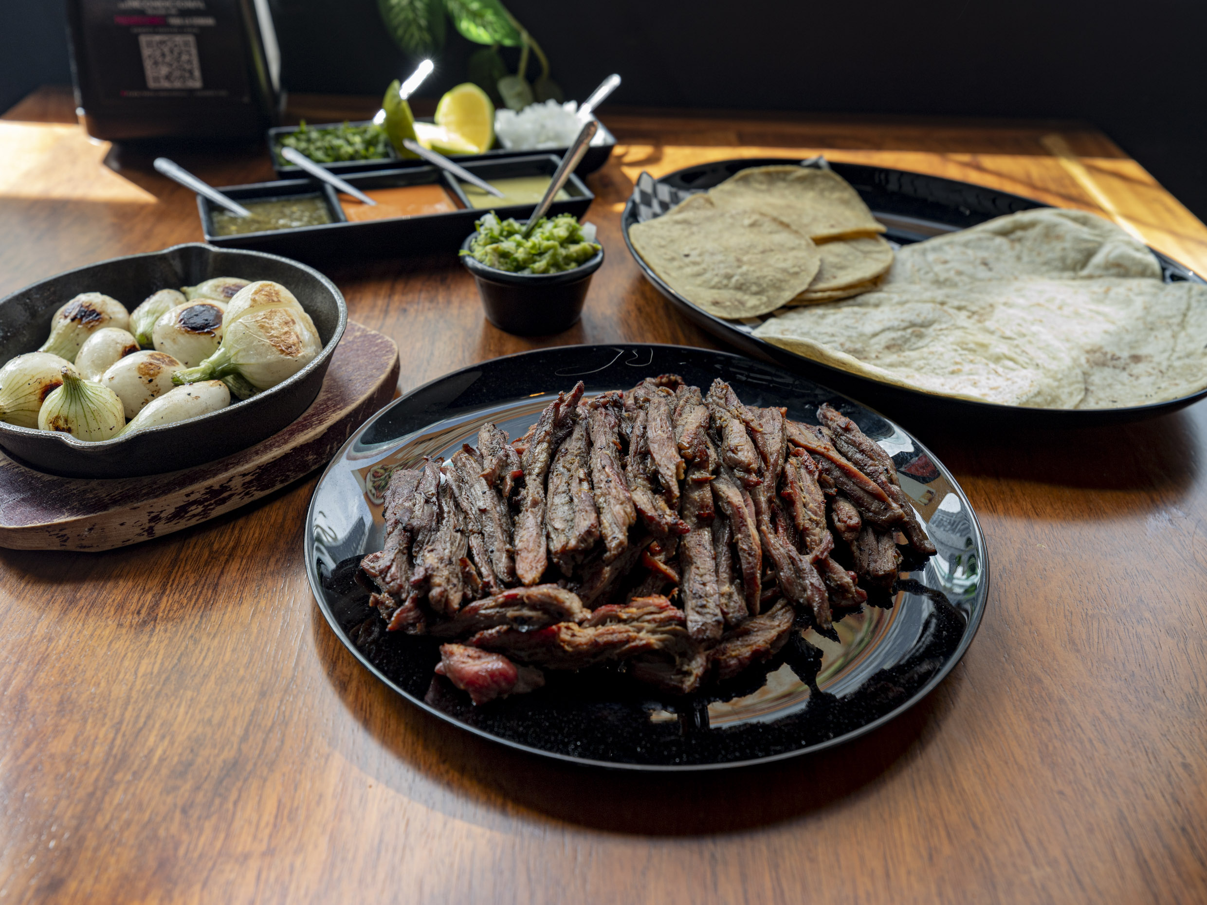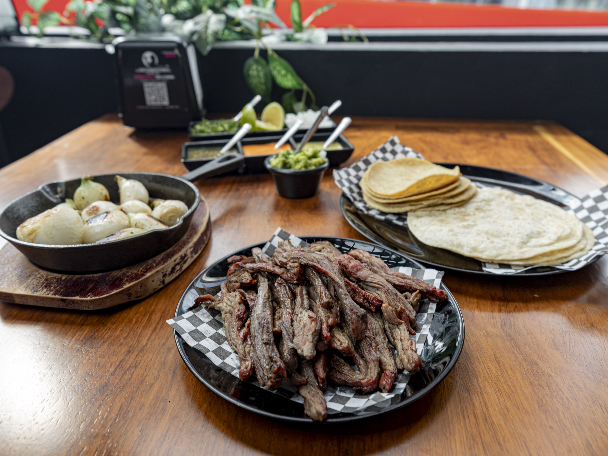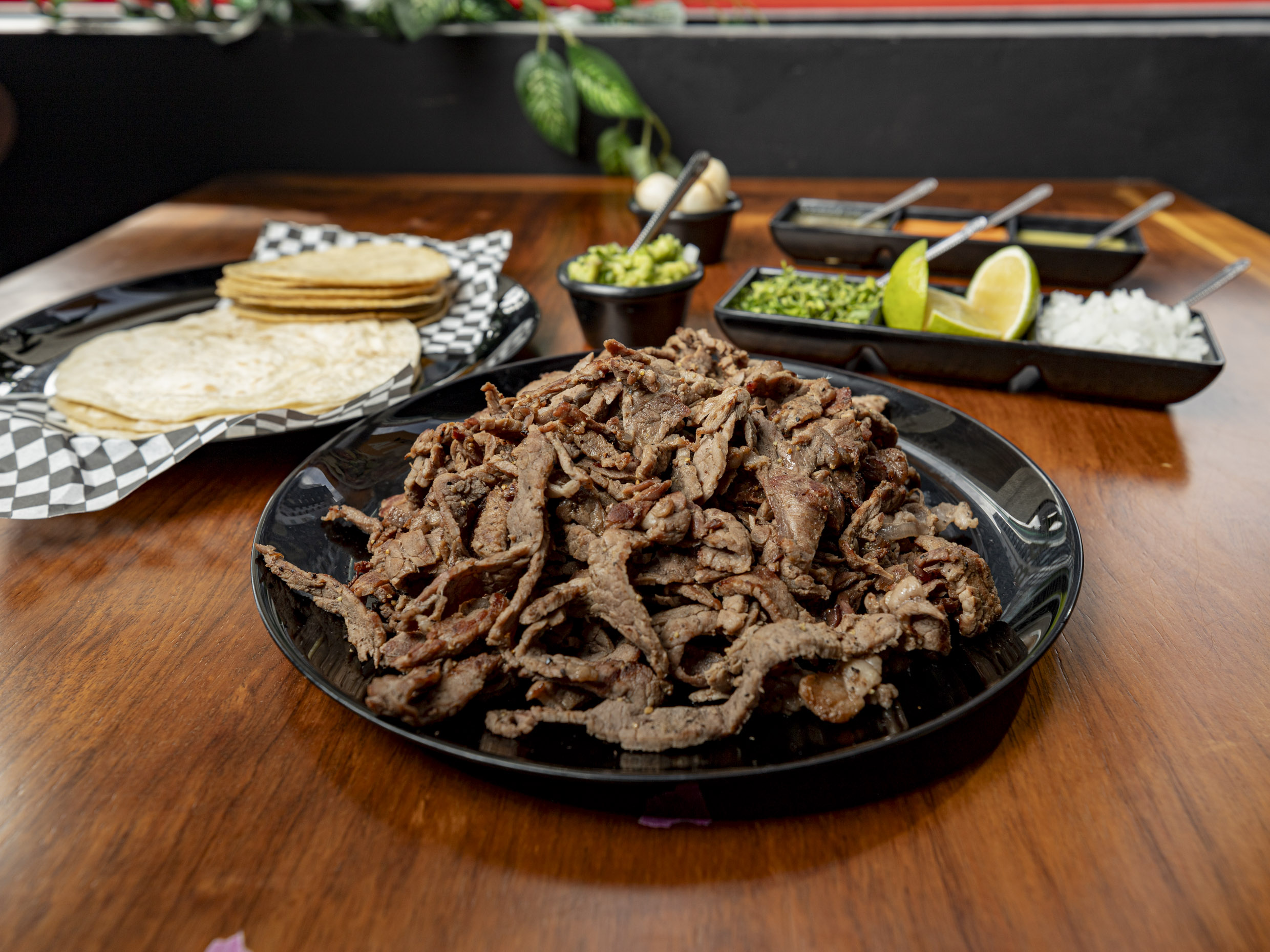 Acompañados de 20 tortillas de maíz, 10 tortillas de harina, orden de cebollitas, guacamole, salsas y limones.