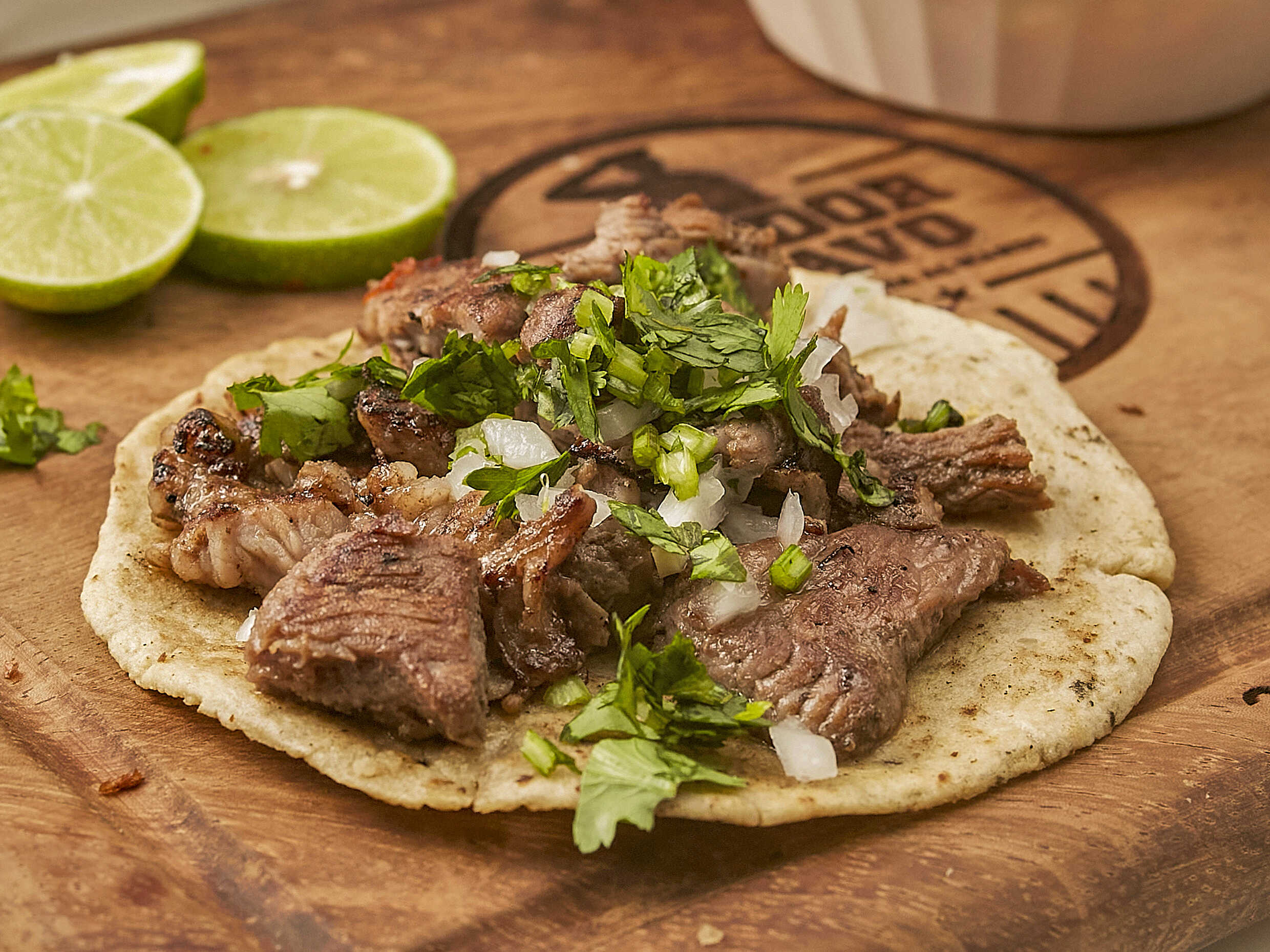 Tradicional taco con 45g de carne, servida en tortilla de maíz: acompañado con limón y tu salsa favorita.