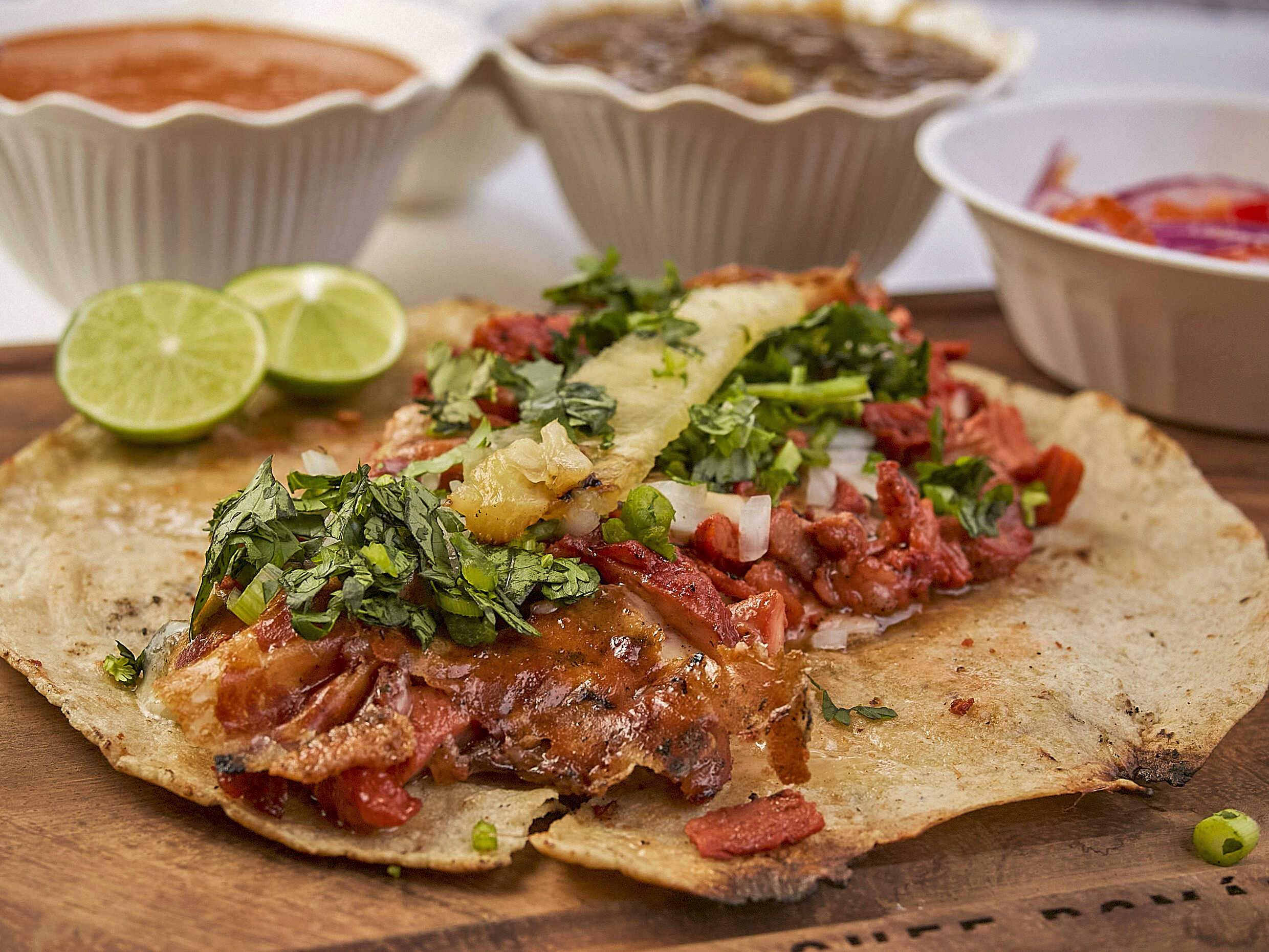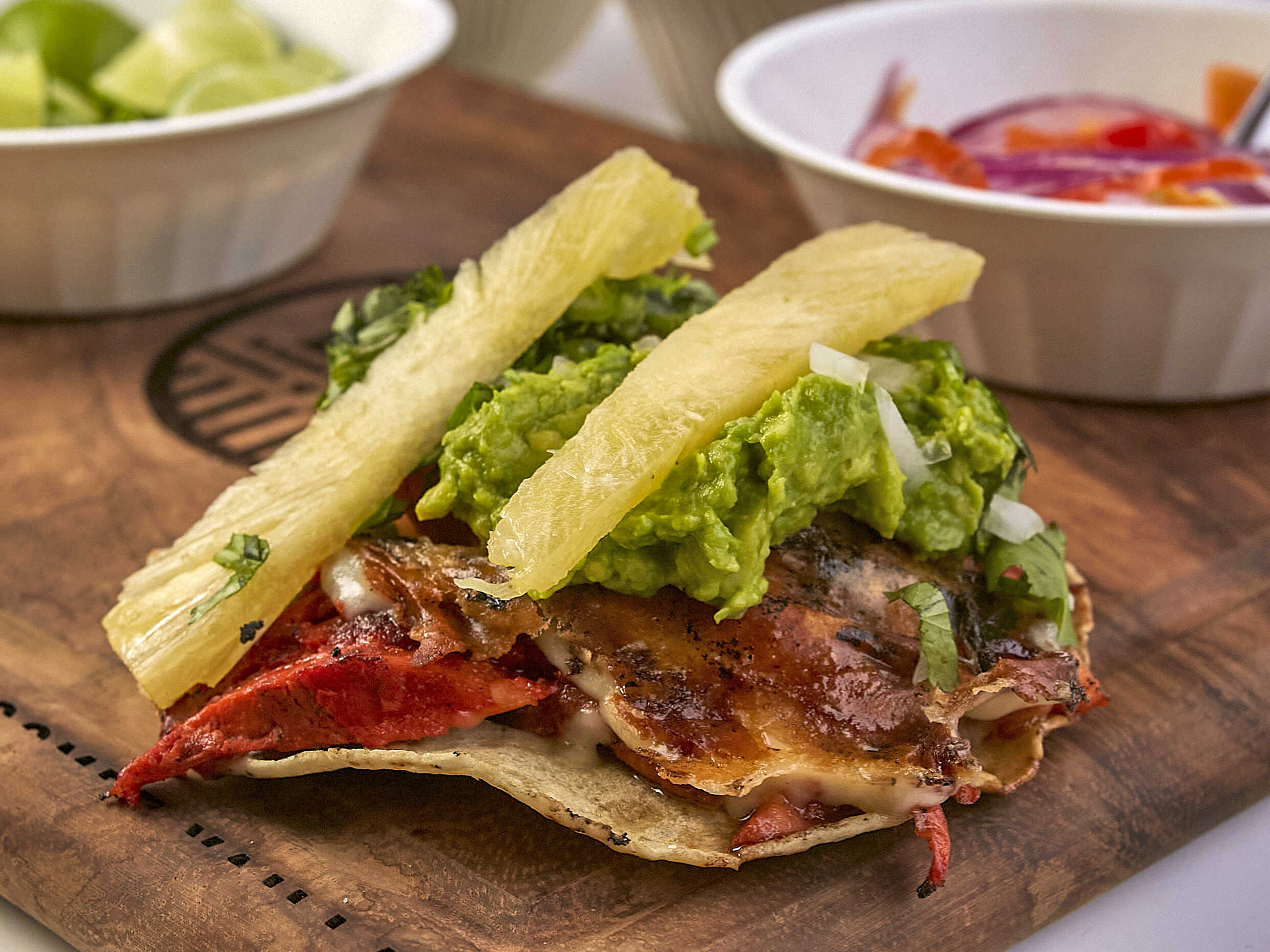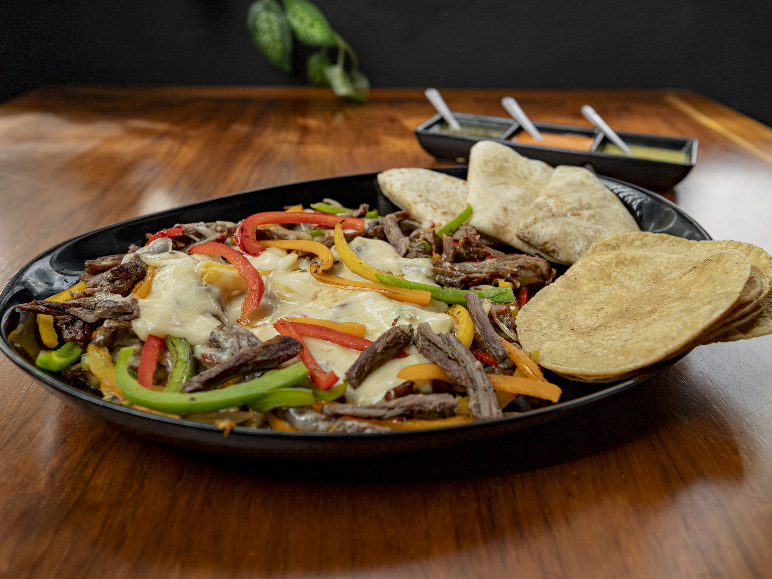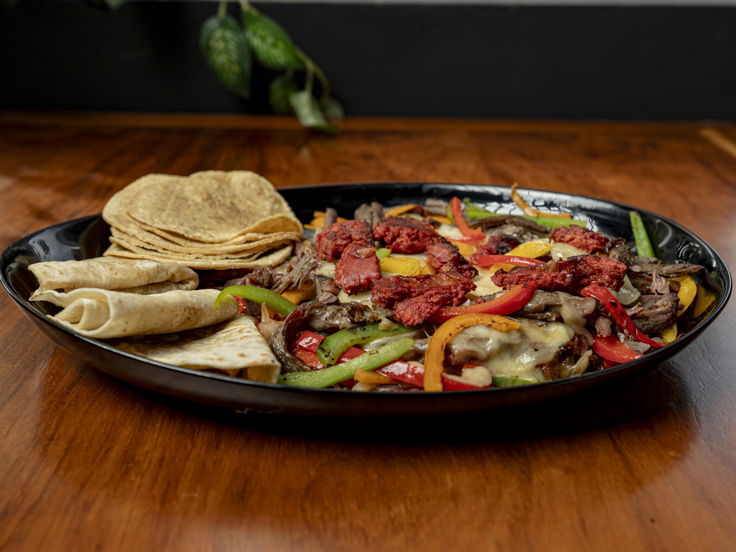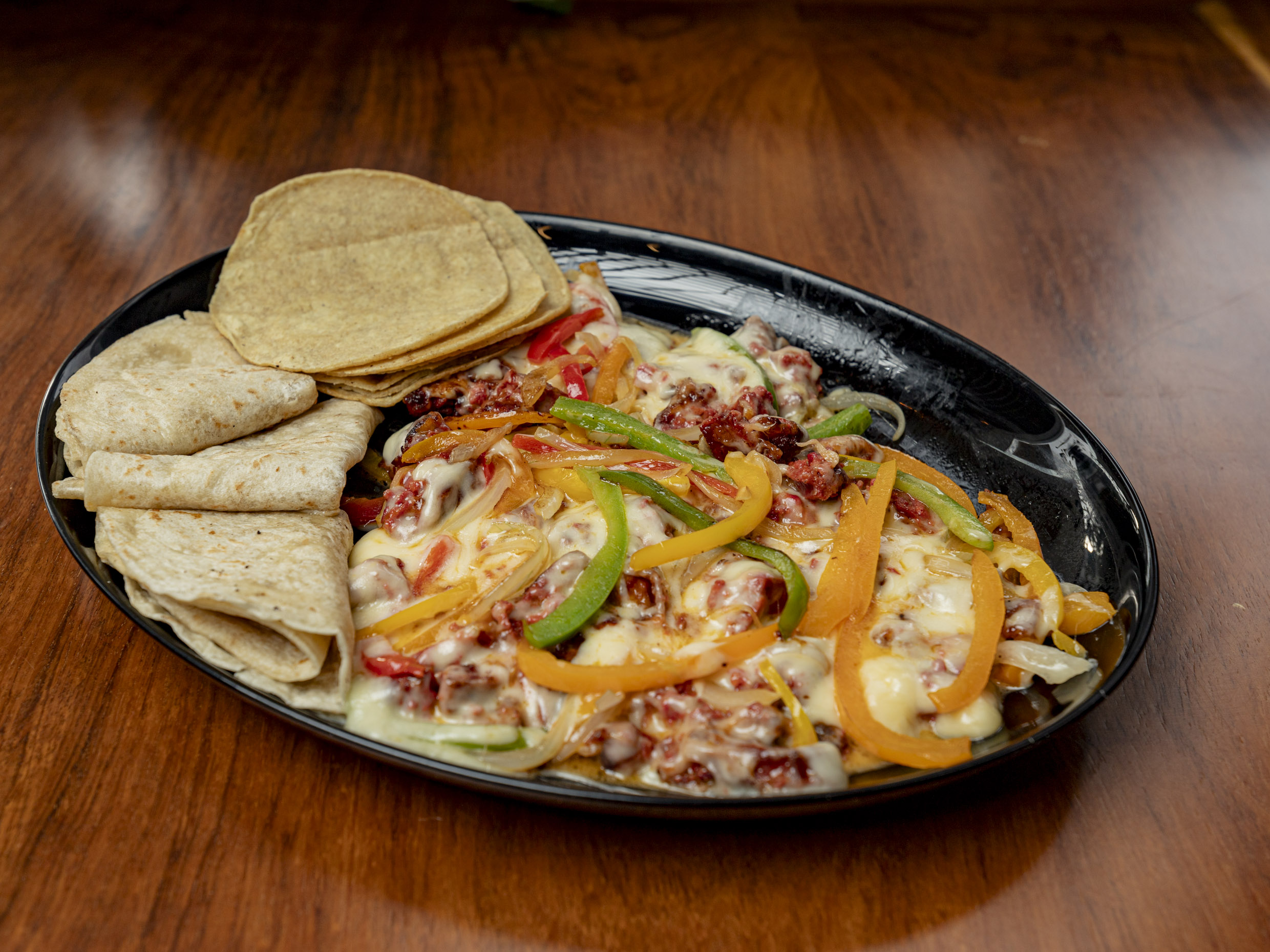 Carne al pastor acompañada de cebolla, pimientos y queso gratinado. Incluye tortillas.