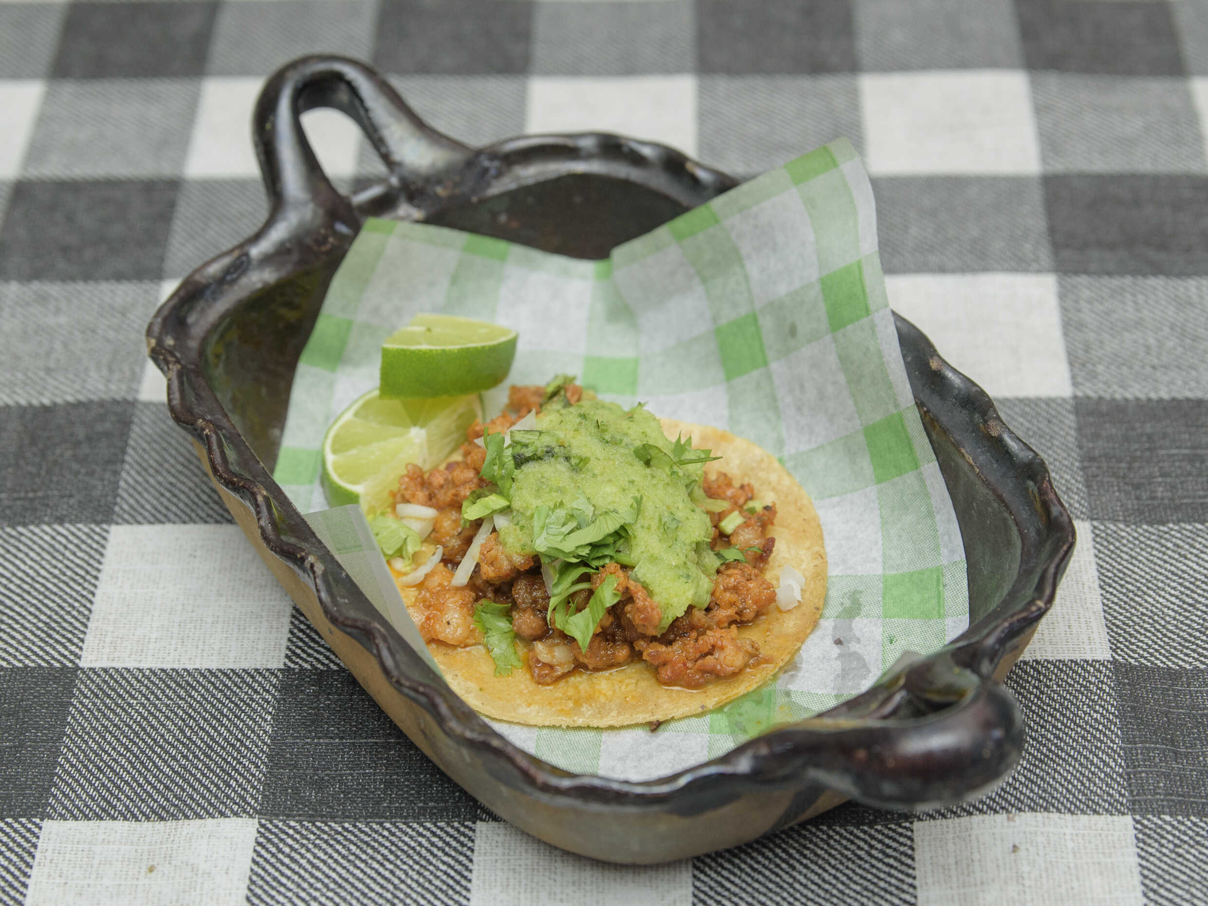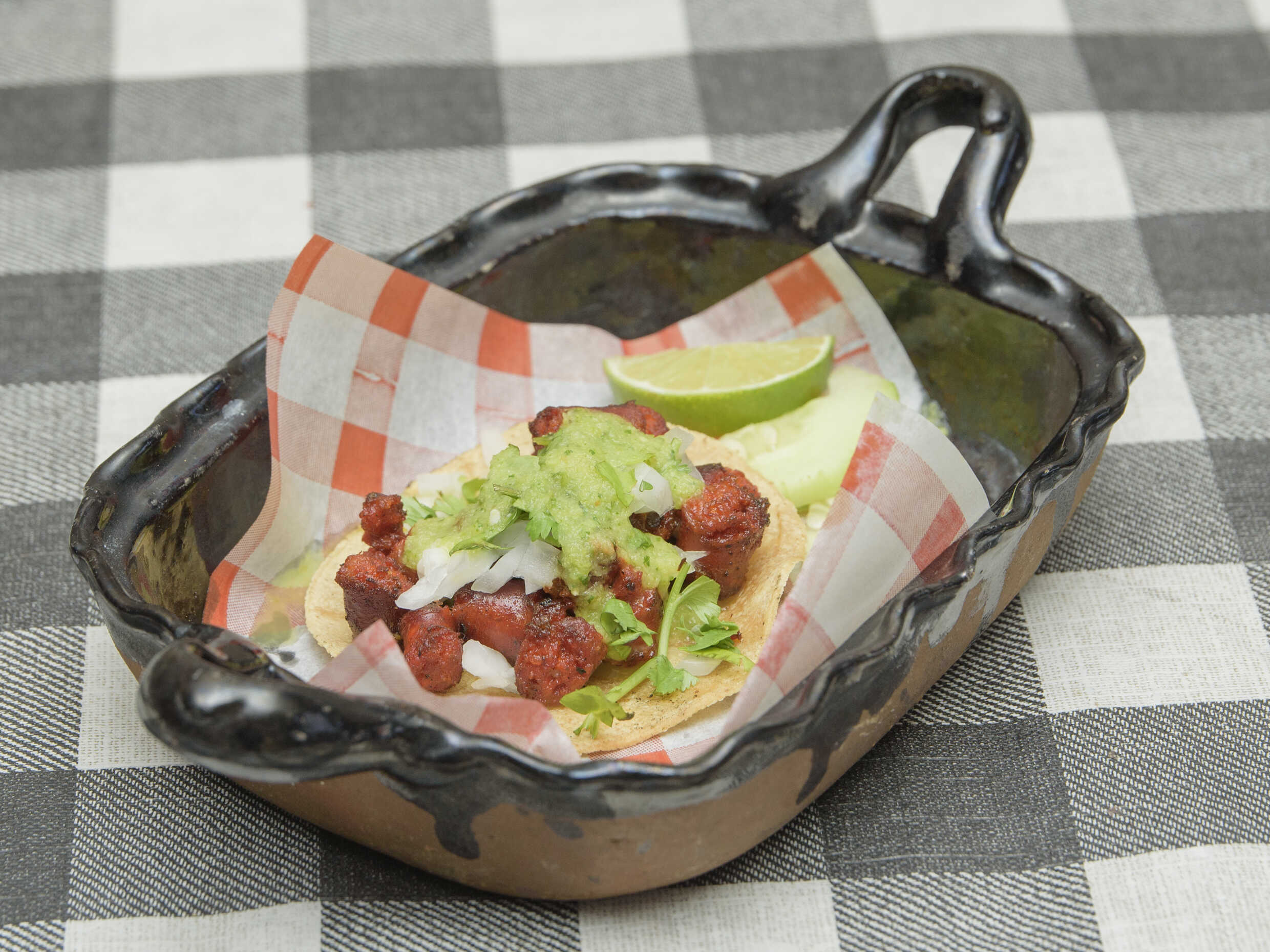 2 Tortillas de maíz, chistorra, cilantro, cebolla y guacamole.