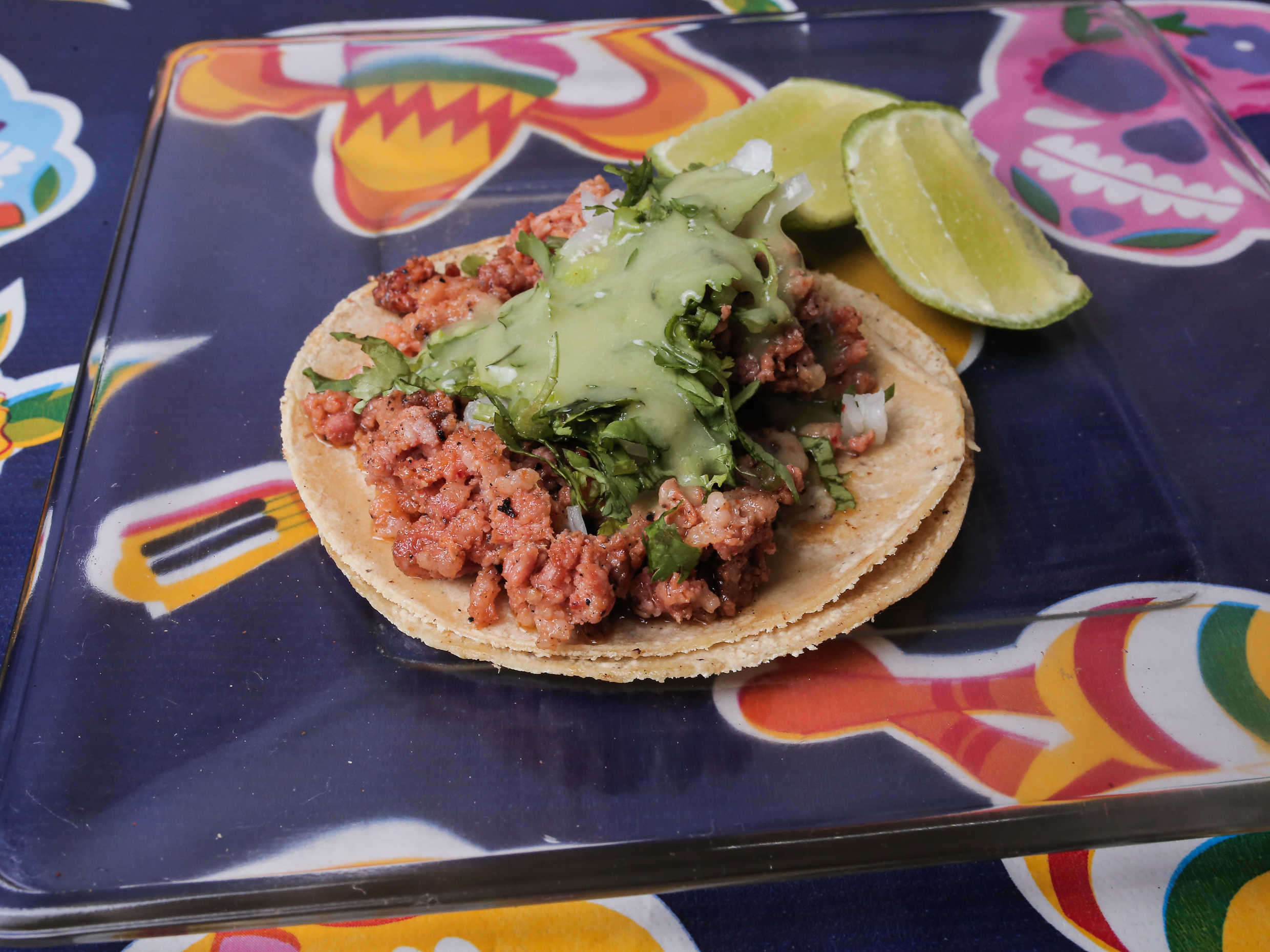 2 Tortillas de maíz tostada, la carne de tu preferencia, cilantro, cebolla y guacamole.