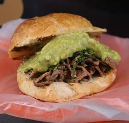 trozo de asada en pan de cemita, cilantro, cebolla y guacamole