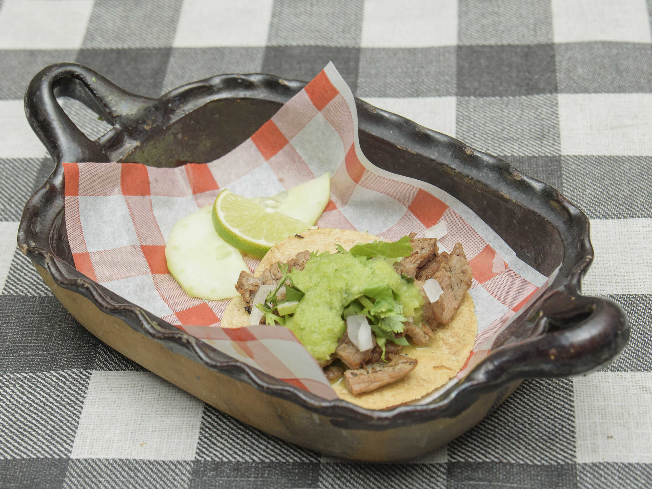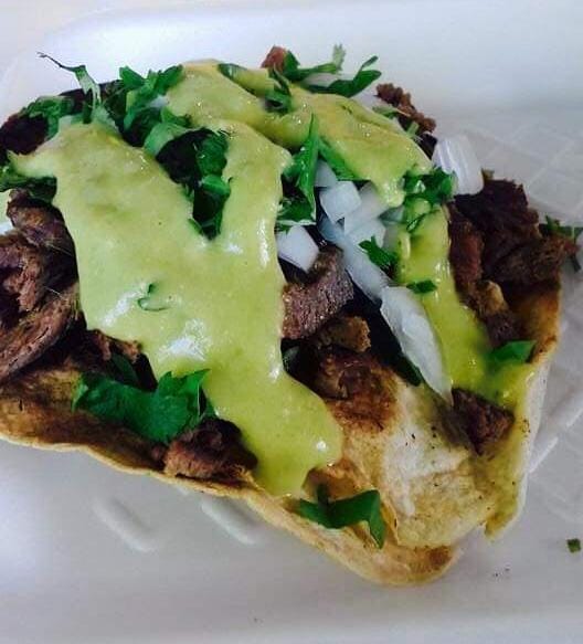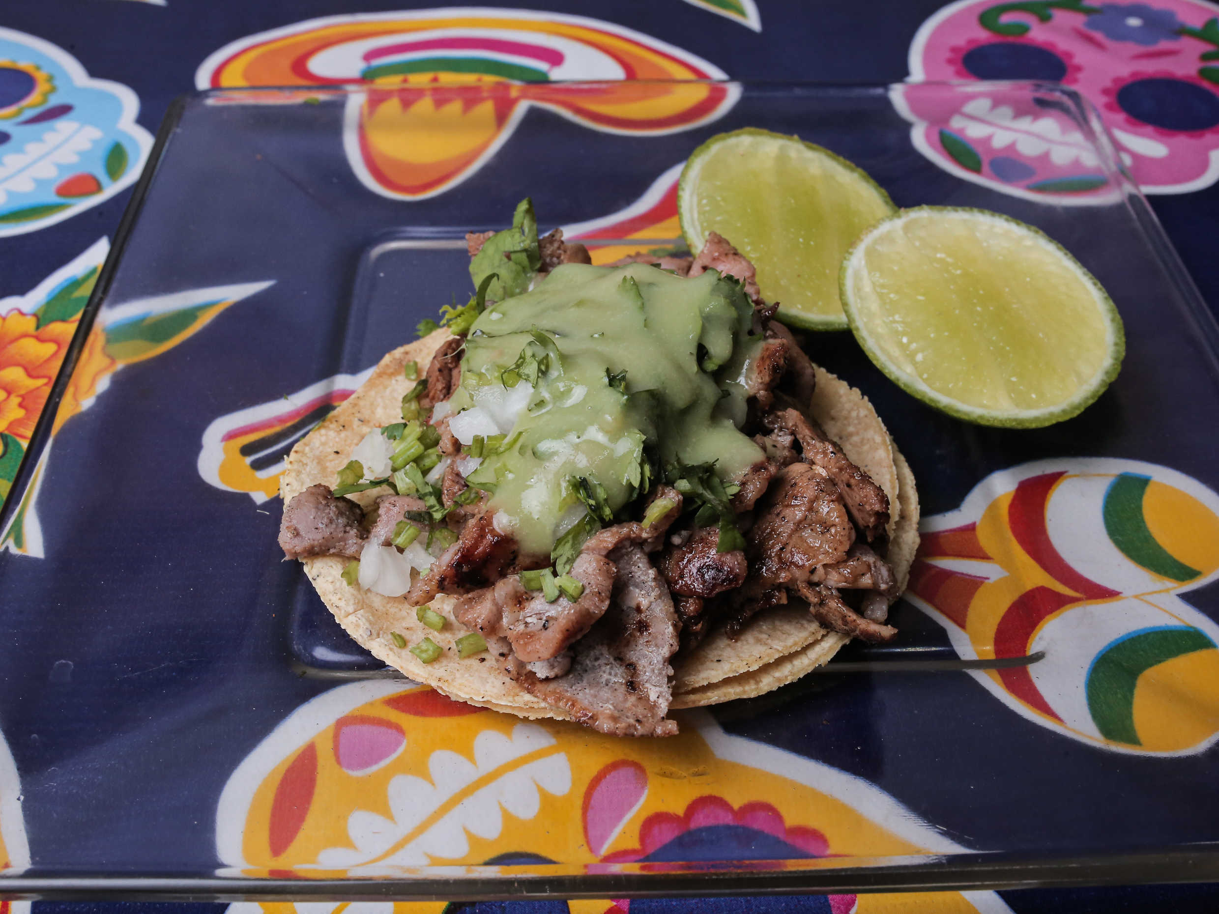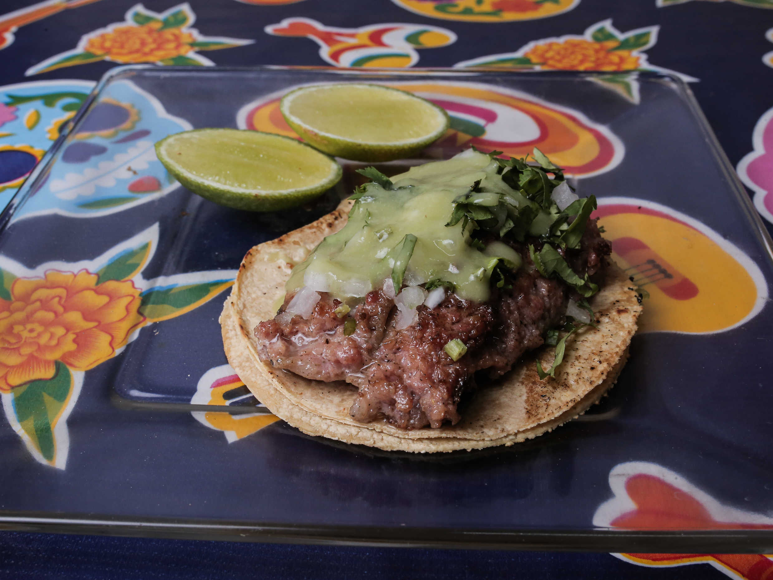 tortilla de maiz jugosa carne asada, cilantro,cebolla y nuestro riquisimo guacamole