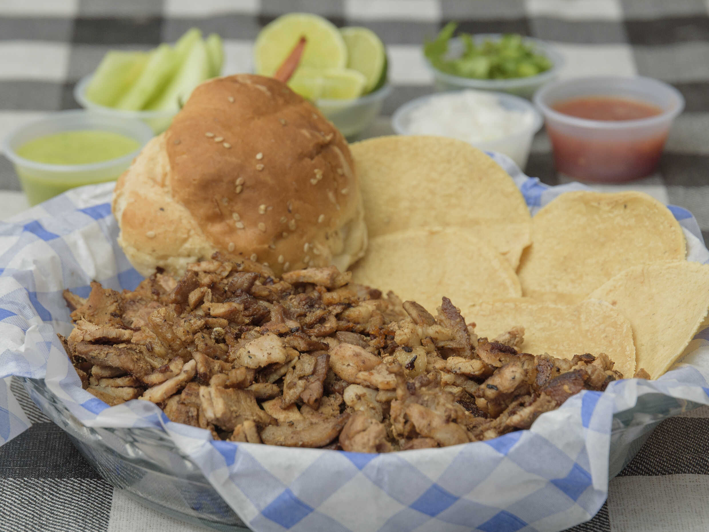 Deliciosa carne asada acompañada de 20 tortillas de maíz, 2 cemitas, cilantro, cebolla, salsas, y limones.