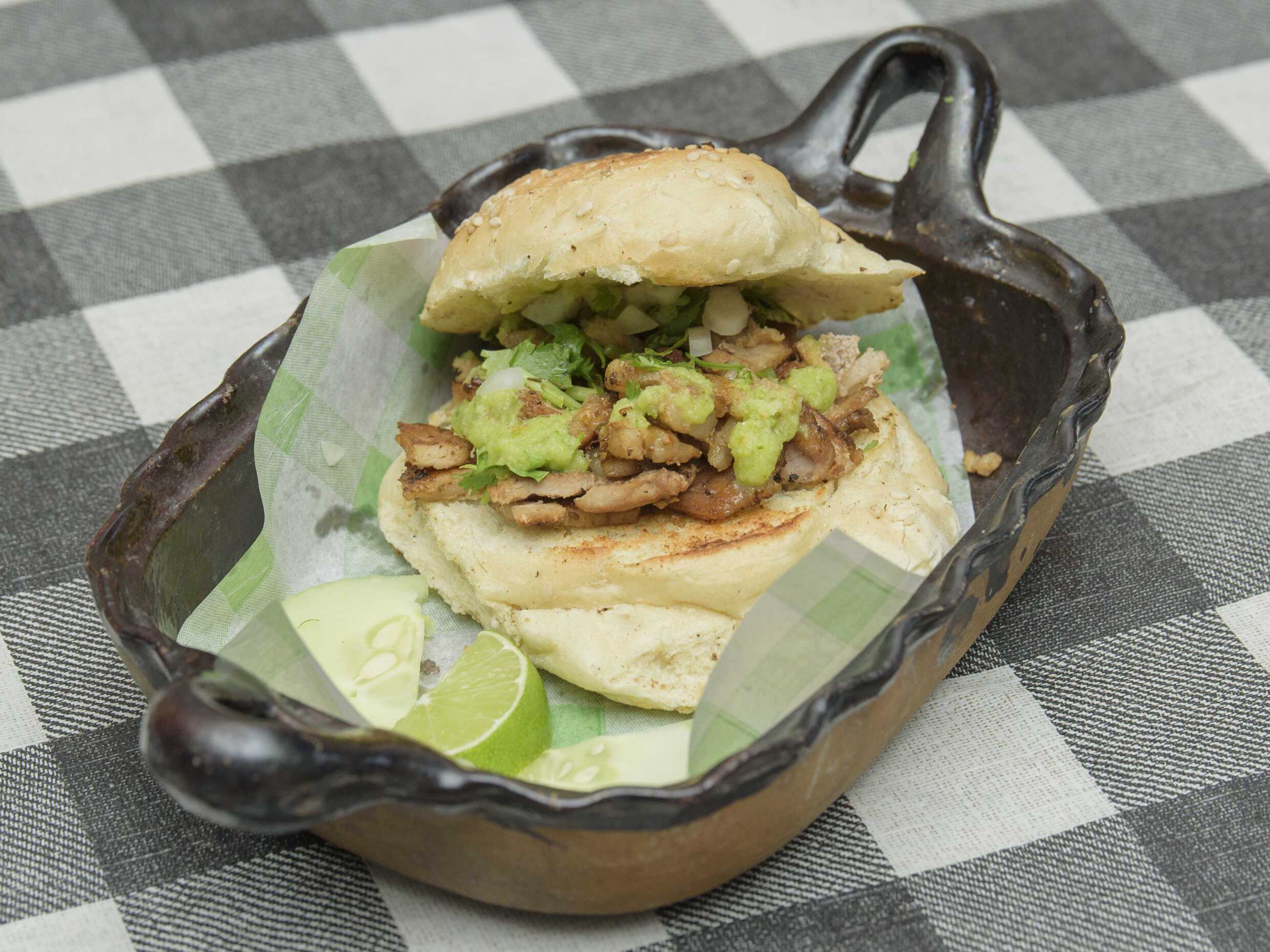 trozo de longaniza en pan de cemita, cilantro, cebolla y guacamole