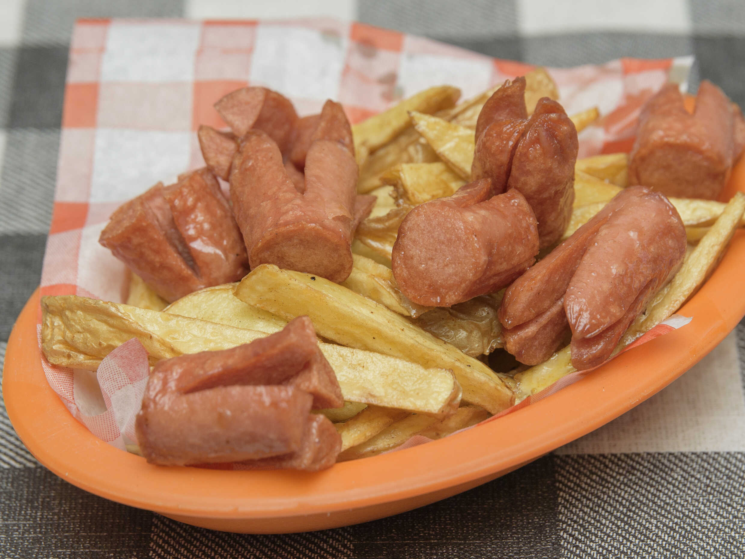 Deliciosas papas en gajo con salchicha acompañadas de nuestro aderezo de la casa.