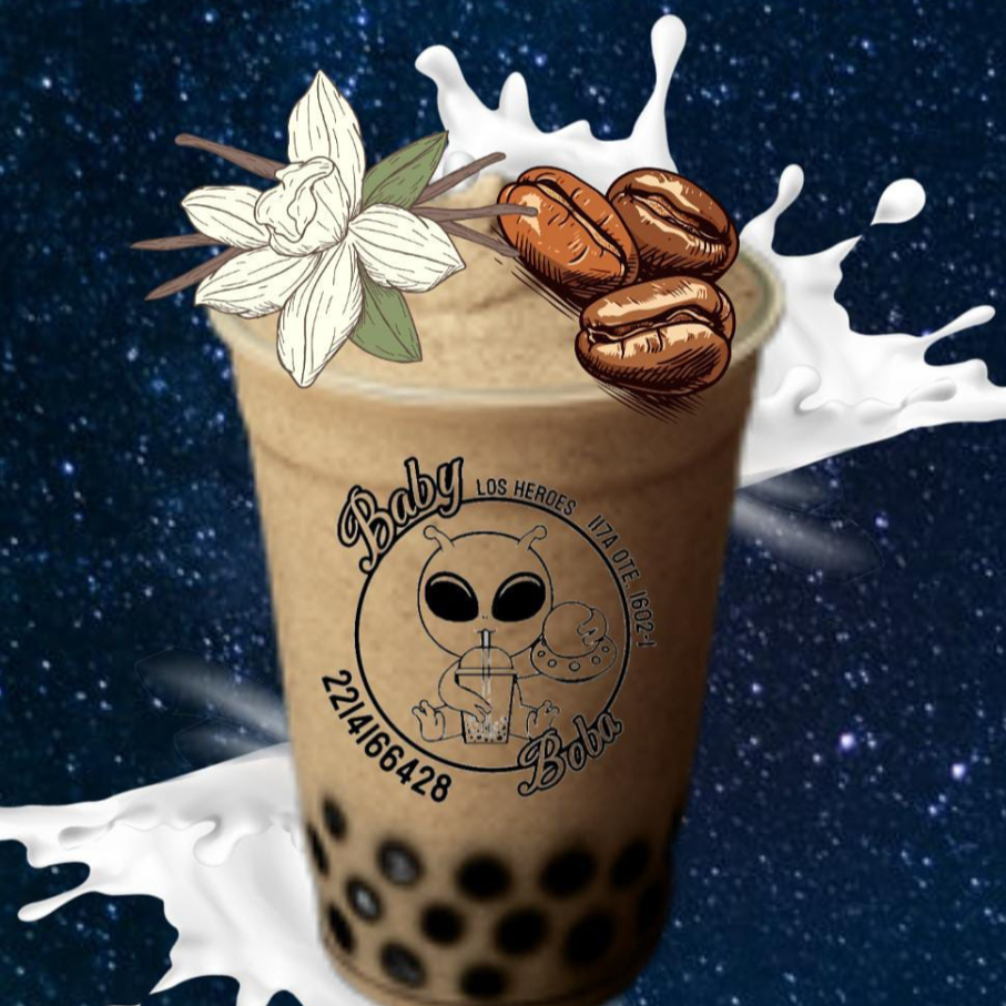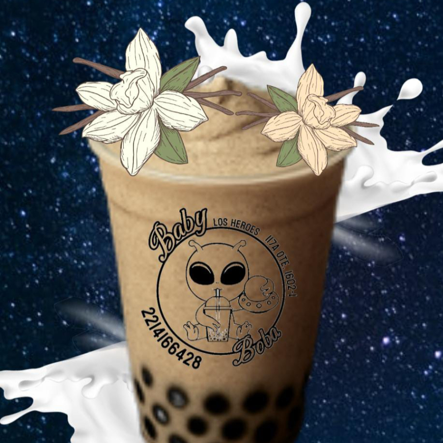 frappe : base leche deslactozada , hielo , 1 expresso de cafe , saborizante de Vainilla francesa , agrega tapioca negra o perla explosiva de tu eleccion , el vaso es de 16 onzas reutilizable y amigable con el ambiente , ademas es tapa termosellada y se empaqueta para que llegue perfecto a su destino final.
