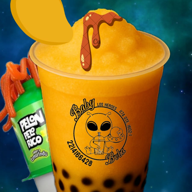 frappe :hielo, te verde , saborizante de mango y peon pelo rico , agrega tapioca negra o perla explosiva de tu eleccion , el vaso es de 16 onzas reutilizable y amigable con el ambiente , ademas es tapa termosellada y se empaqueta para que llegue perfecto a su destino final.